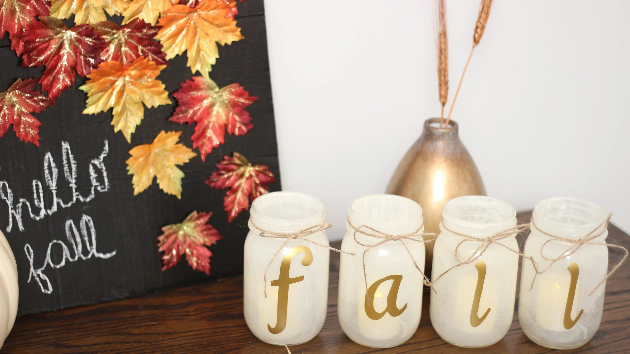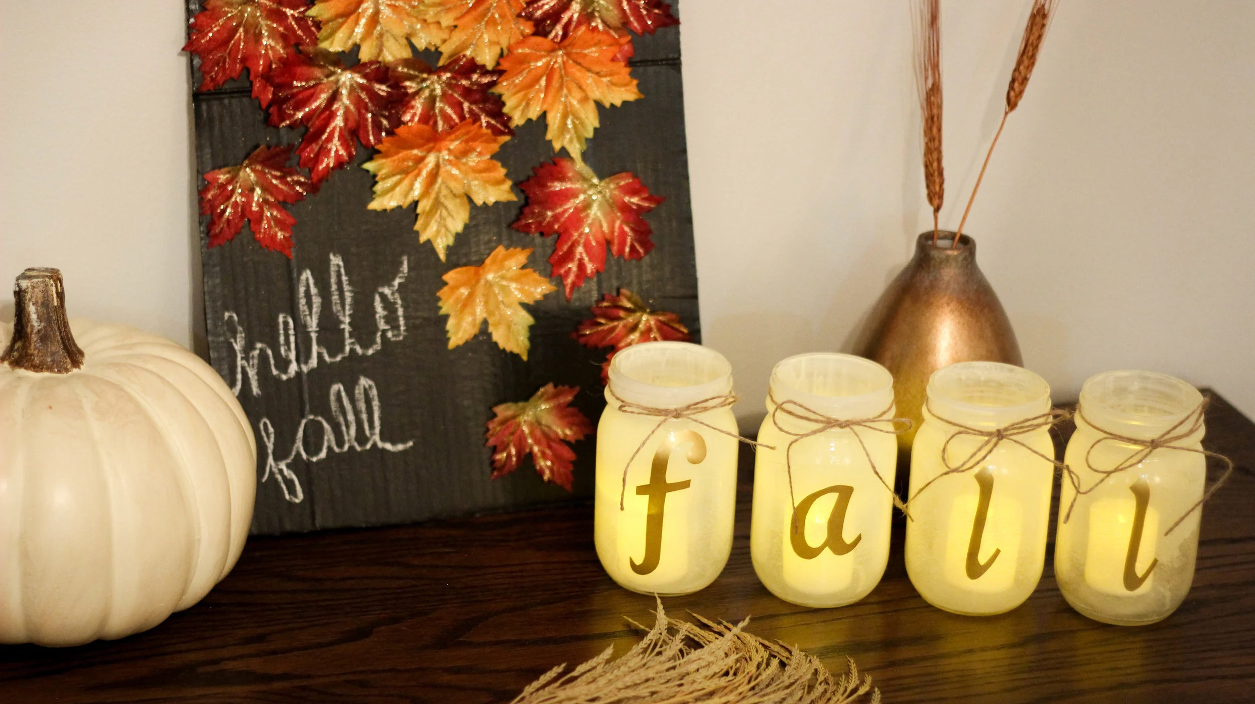 Using a piece of twine or ribbon, tie a bow around the rim of each jar and trim the ends to your liking. Add battery operated candles and that's it! These are such a beautiful addition to my fall decor and I just love the subtle glow that they add to the room.