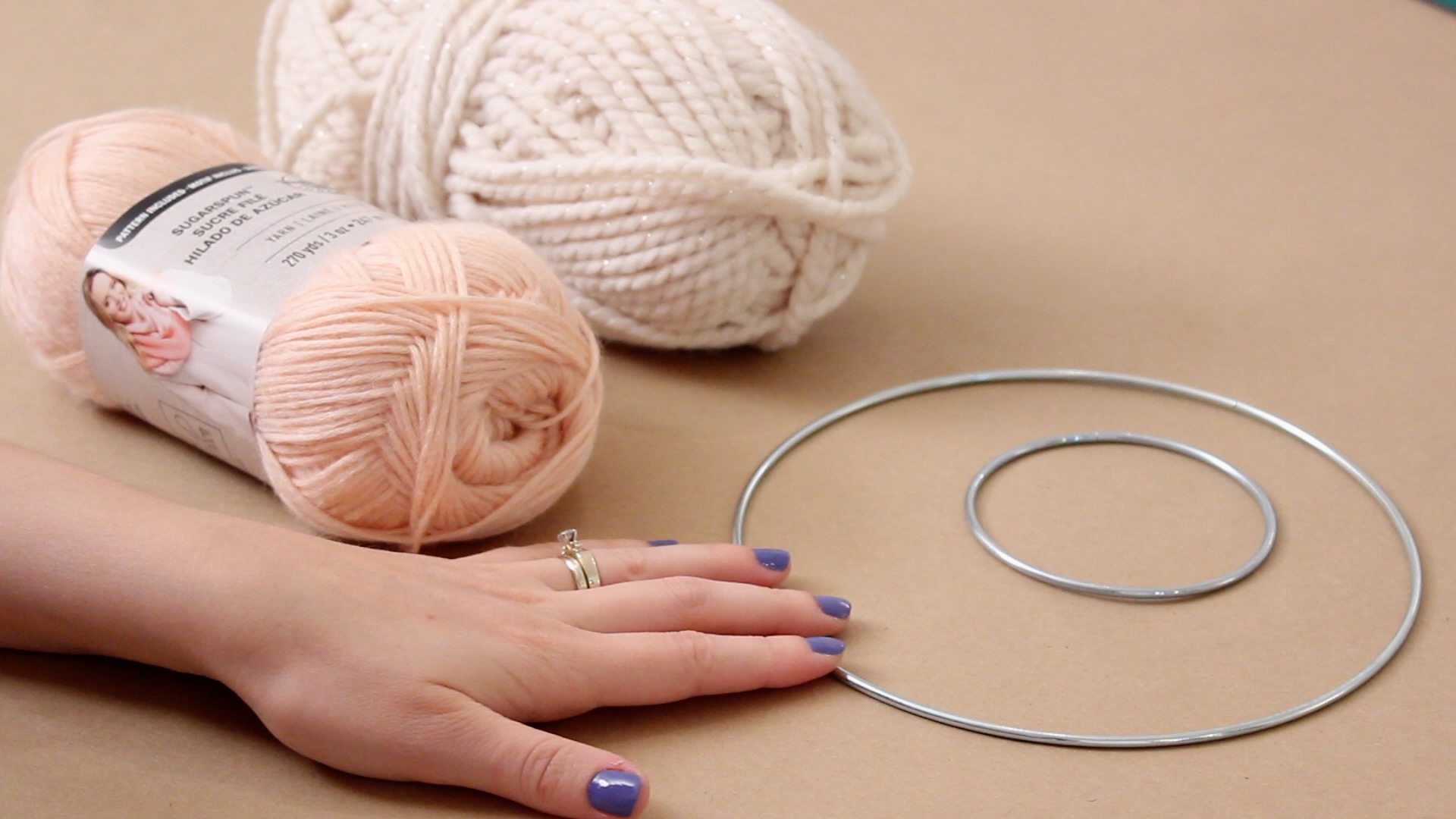Choose any two colors of yarn that you want to use for your wall hanging. You can find these metal rings in the leather section of the craft store. You will need two different sizes.