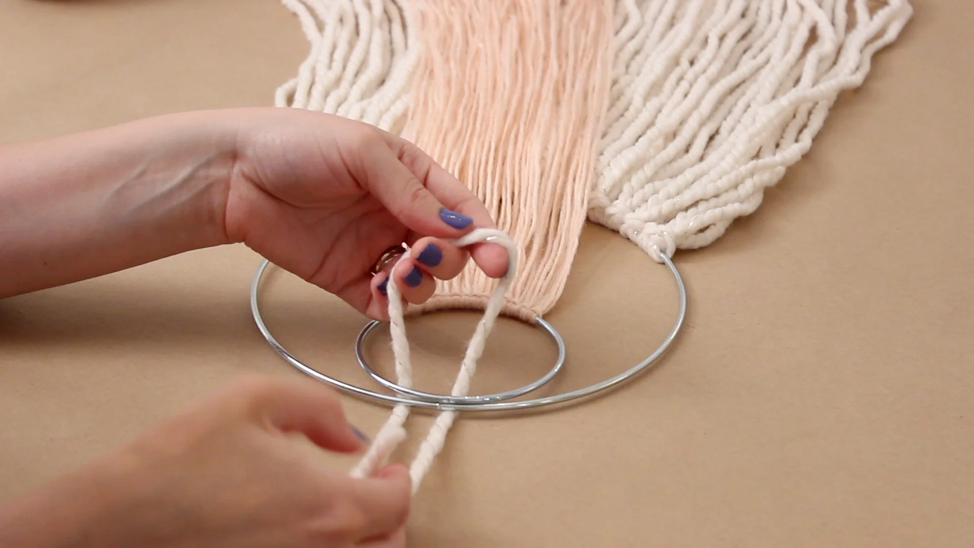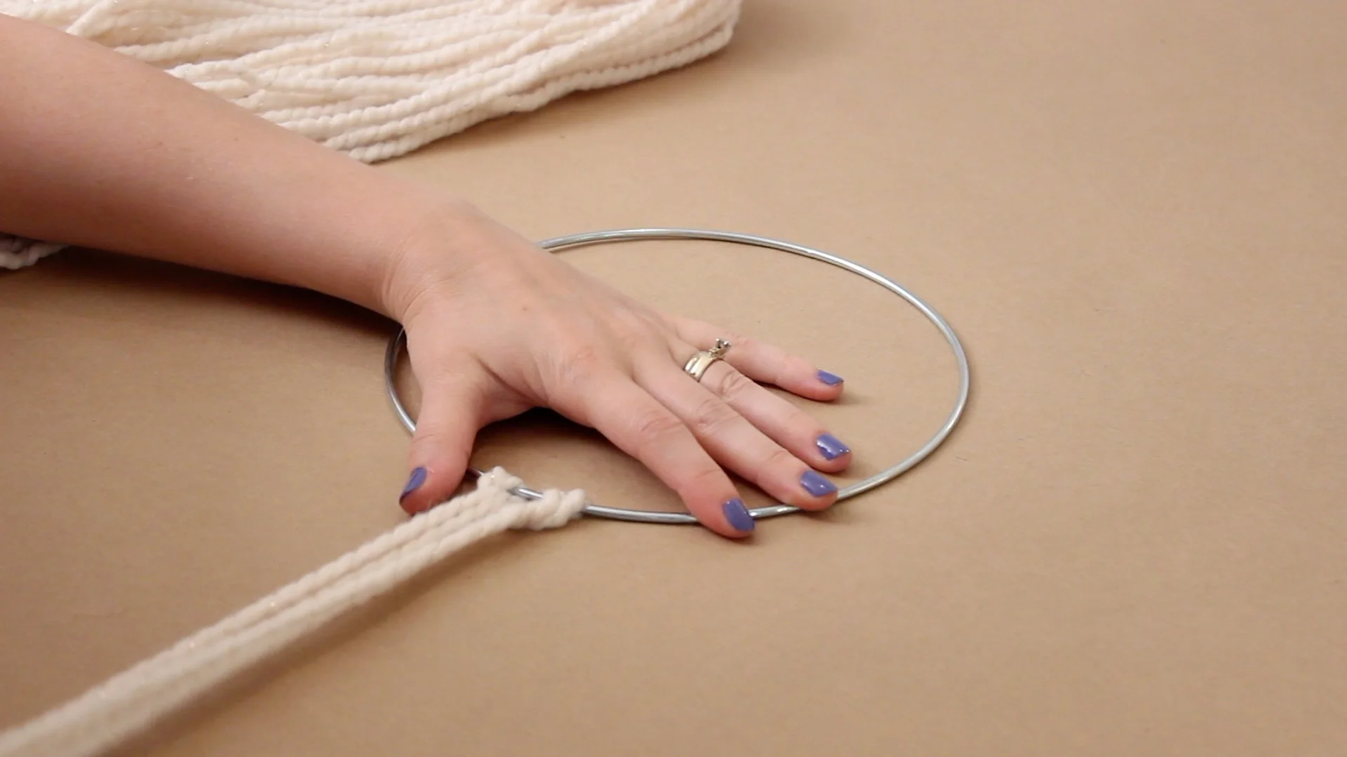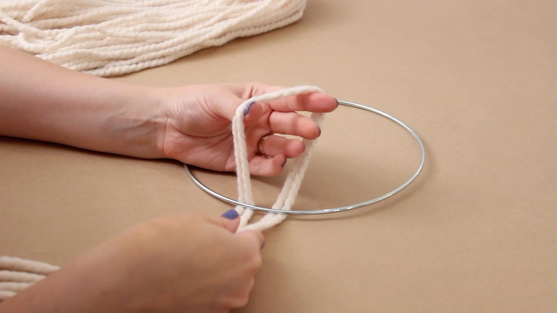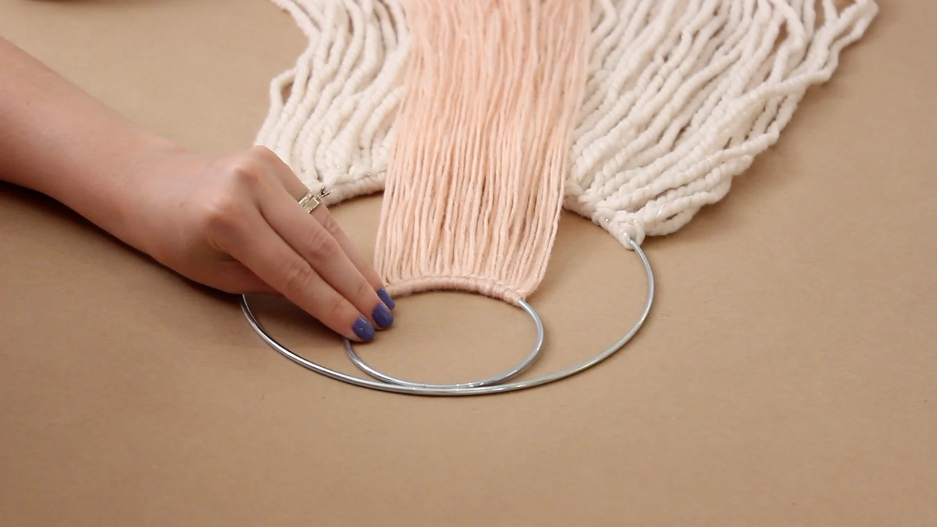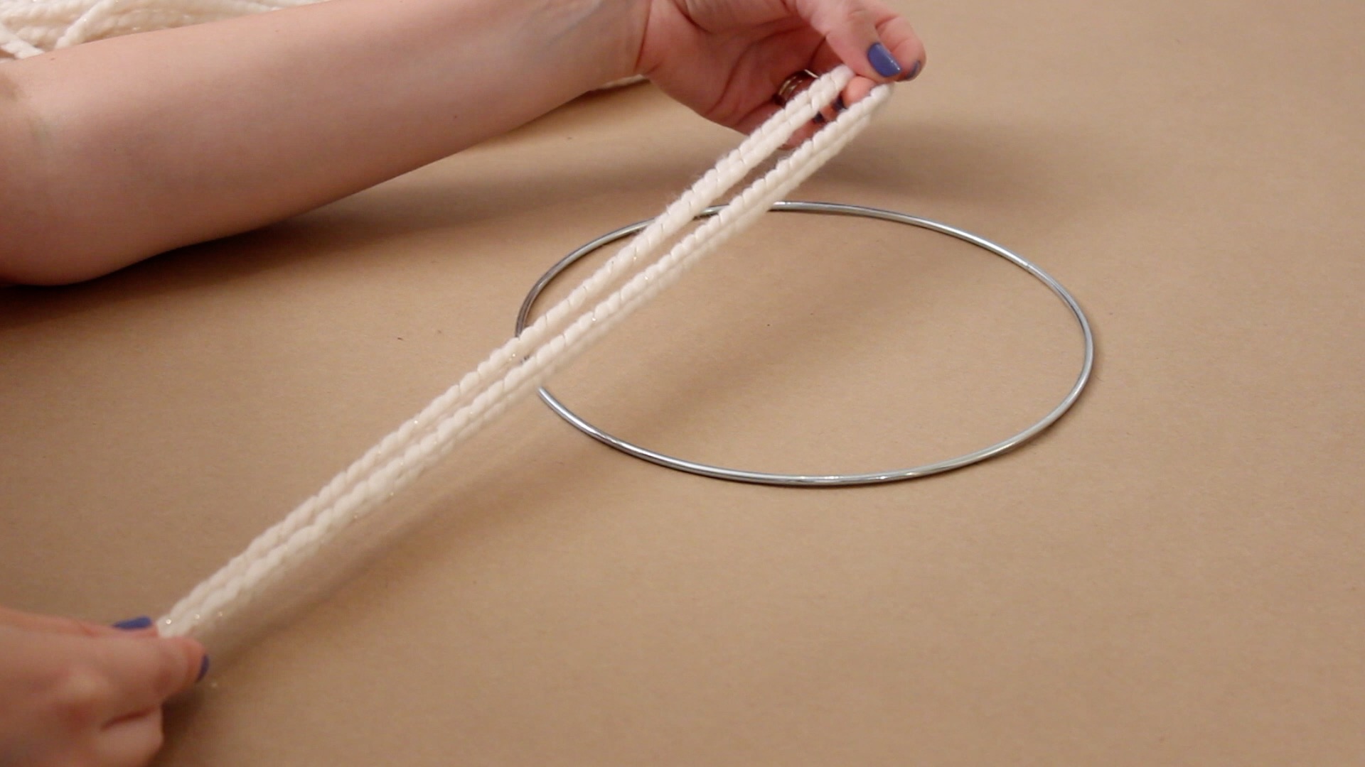 Cut an extra piece of yarn and tie the ends together in a double knot. Slide it under both rings and bring the knot end through, pulling it up and tightly against the ring. This will be used to hang it up.