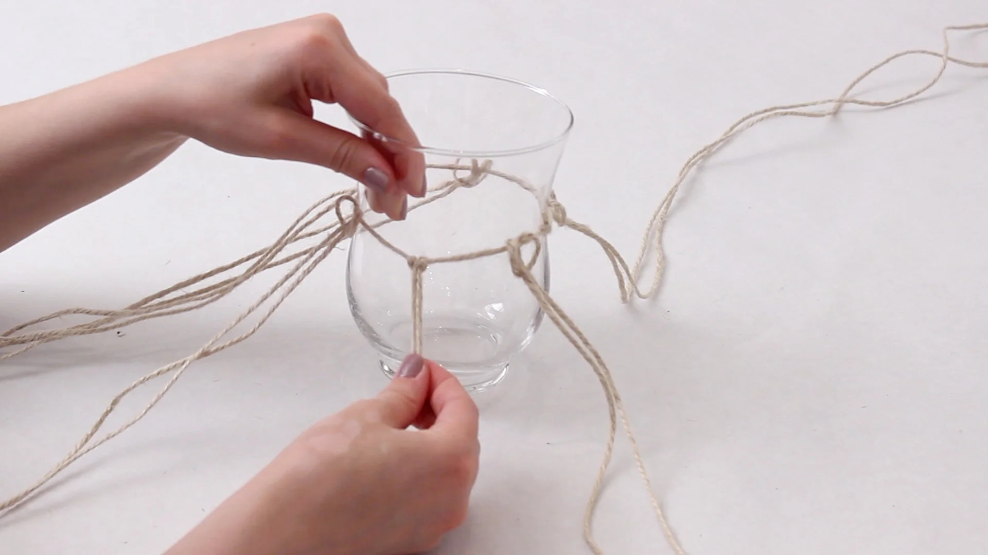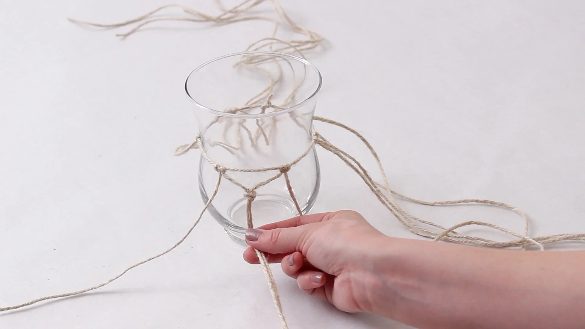 Choose 2 knots and grab the 2 pieces of string that rest between them. Loop those 2 pieces of string around themselves to form a knot. Repeat this process all the way around the jar.