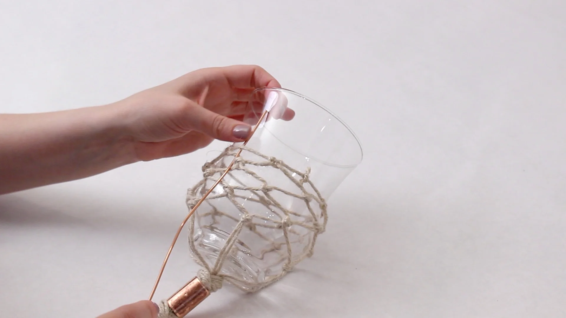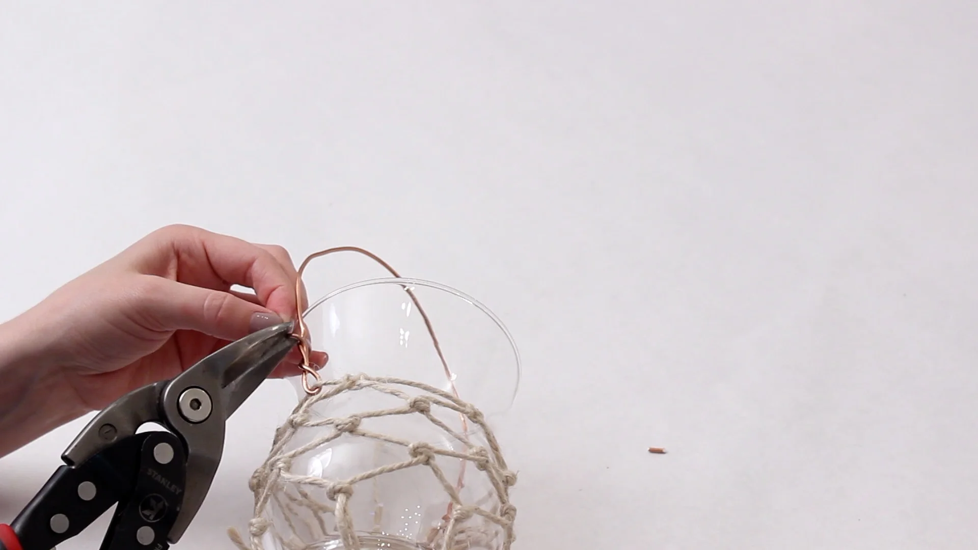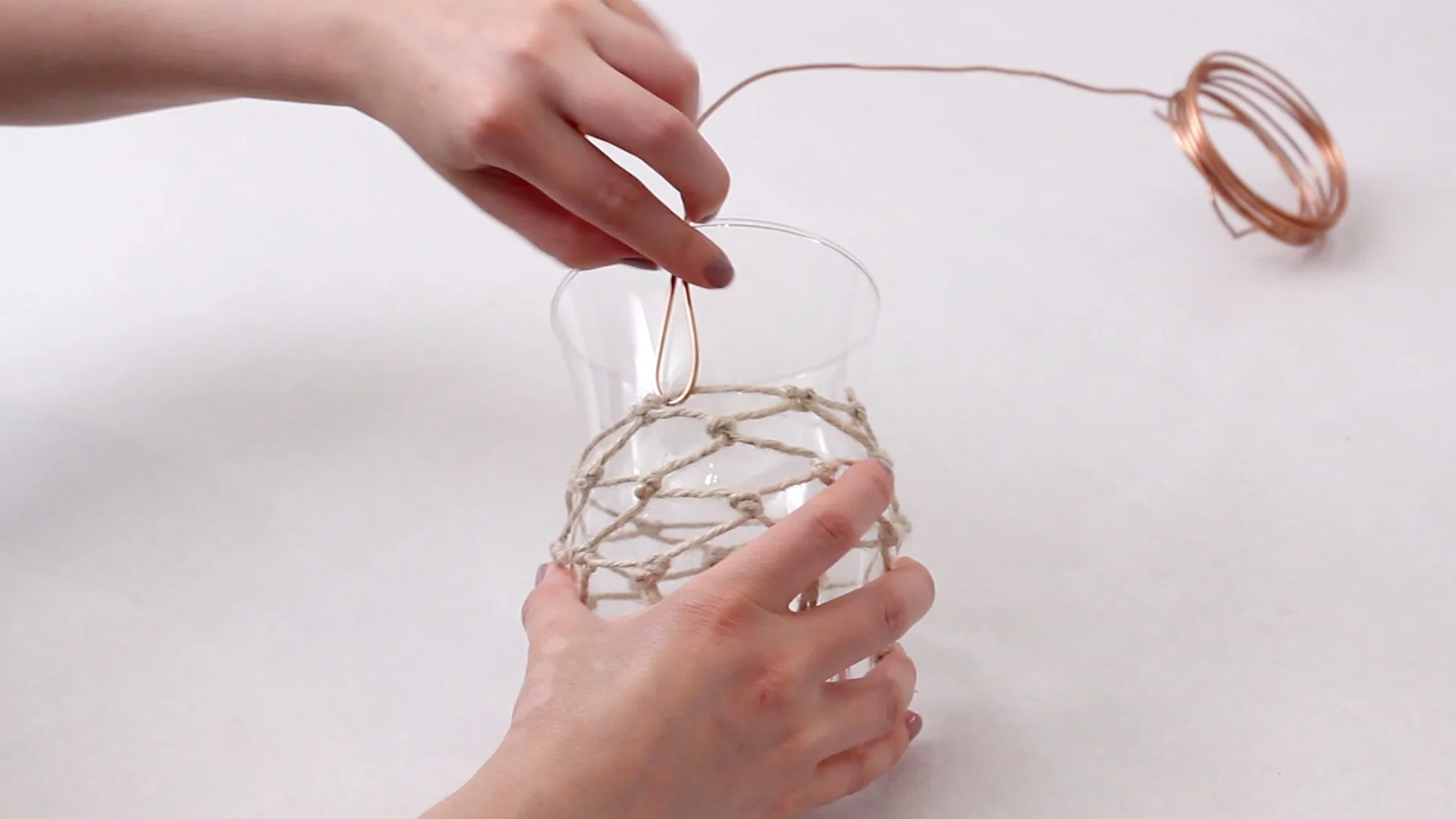 Bring the wire over to the other side, forming a handle shape. Use wire cutters to cut it, leaving a few inches to work with. Once again, slide it under the top piece of twine and twist it around itself. Snip the excess. Add a candle (real or battery operated) hang it up and enjoy your newest creation!