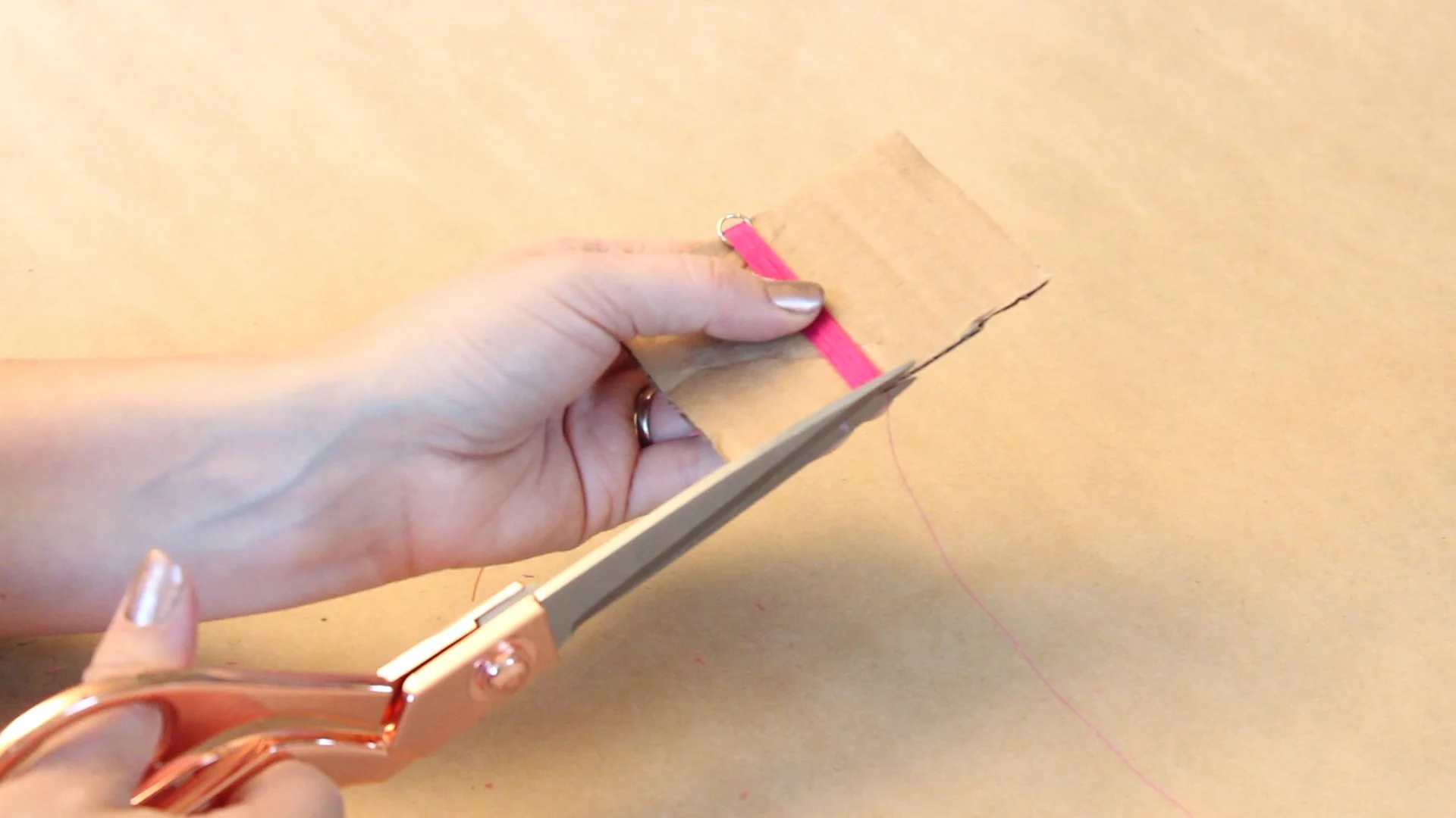 Cut the excess thread at the bottom of the cardboard and then carefully slide the entire loop off of the cardboard.