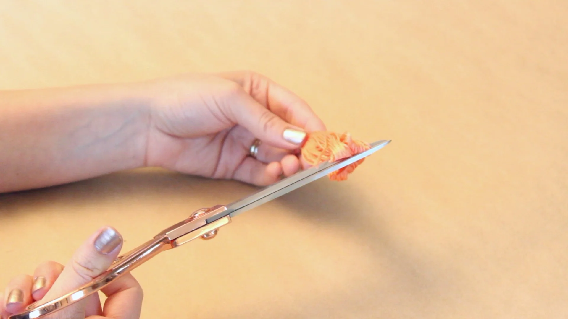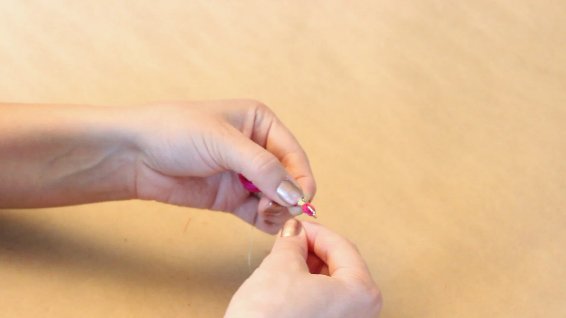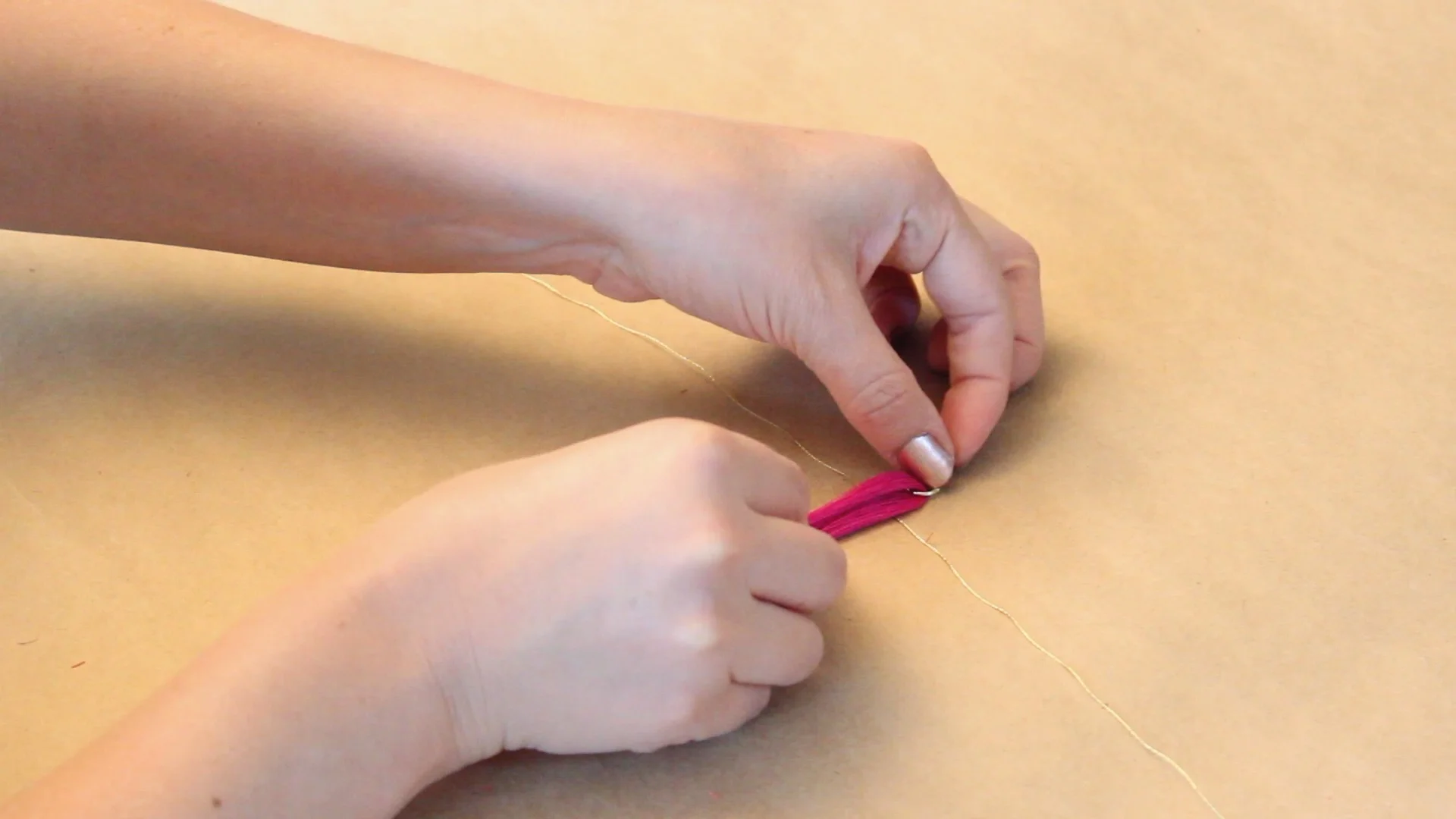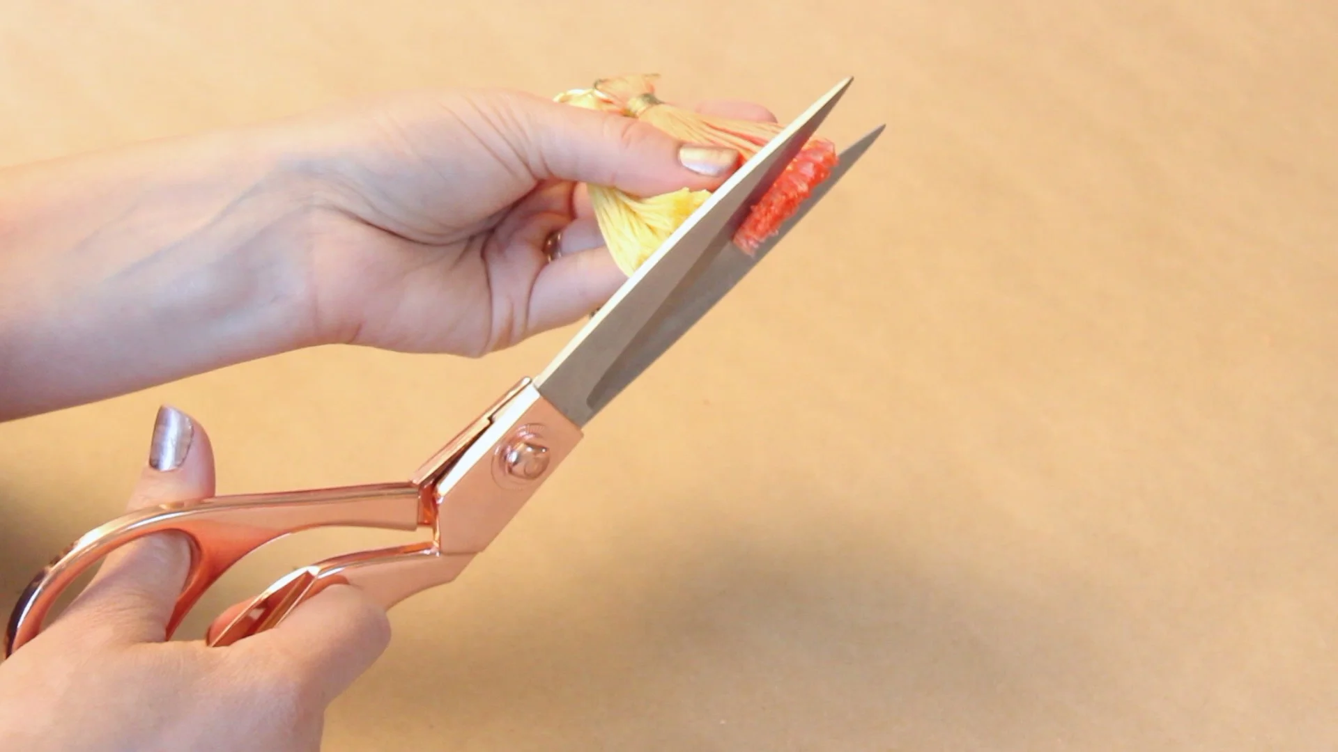 Slide your scissors through the loop at the bottom, cut, and then trim the ends so they are even. Repeat with your second color of thread.