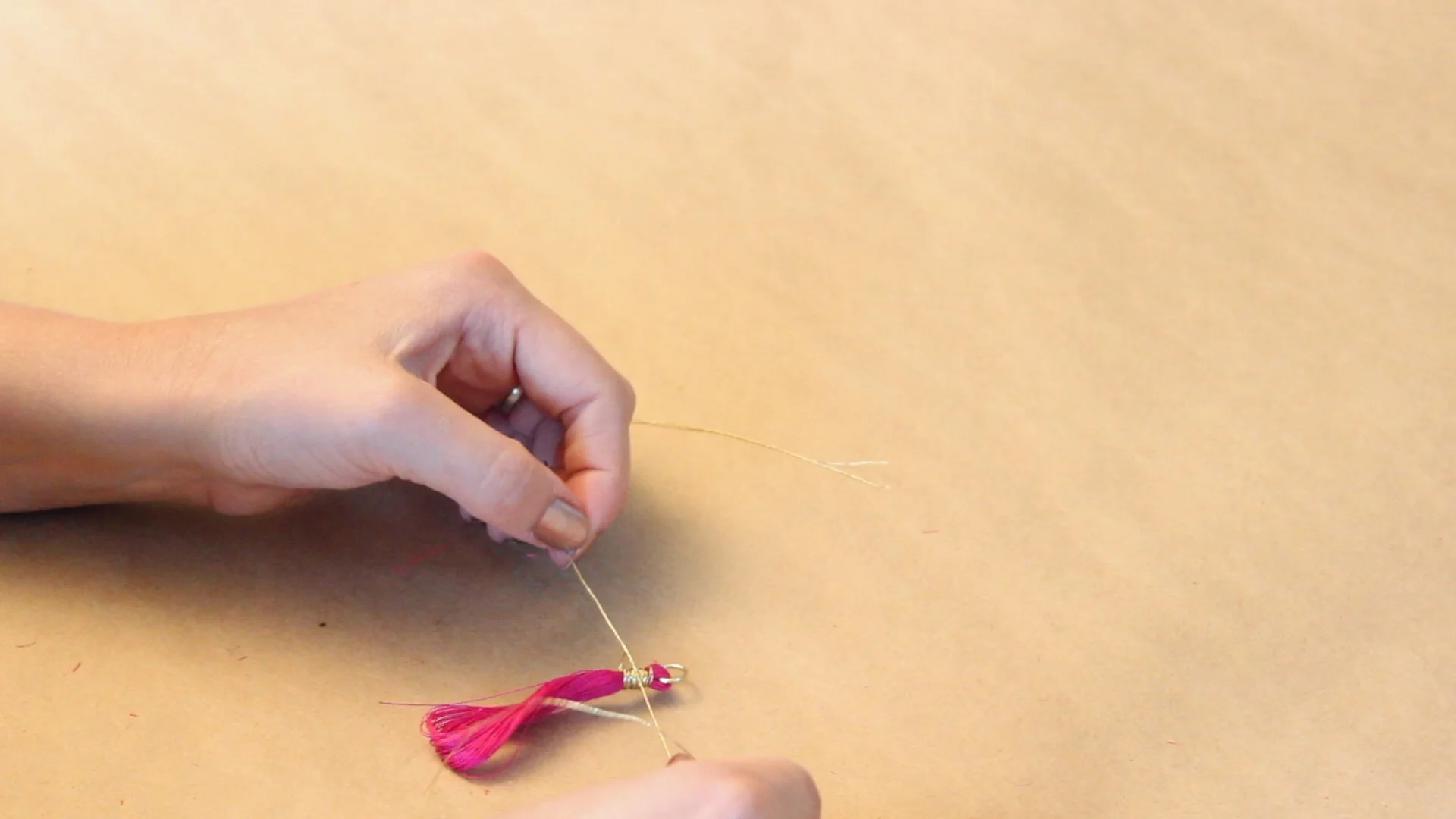 Wrap the gold thread around the colorful thread a bunch of times, moving toward the jump ring at the top. Once you are satisfied with the way it looks, tie another double knot and snip the ends of the gold thread.