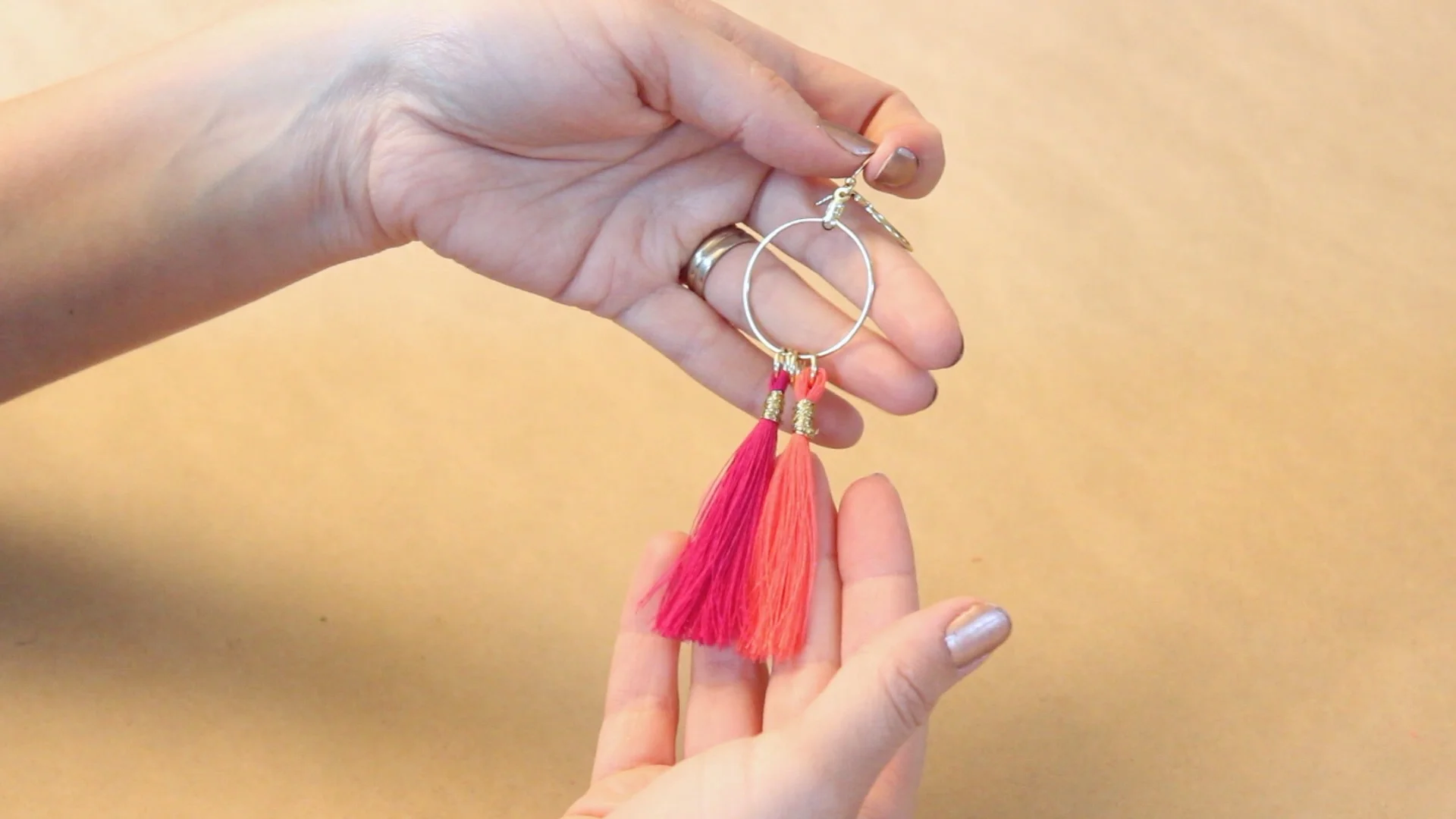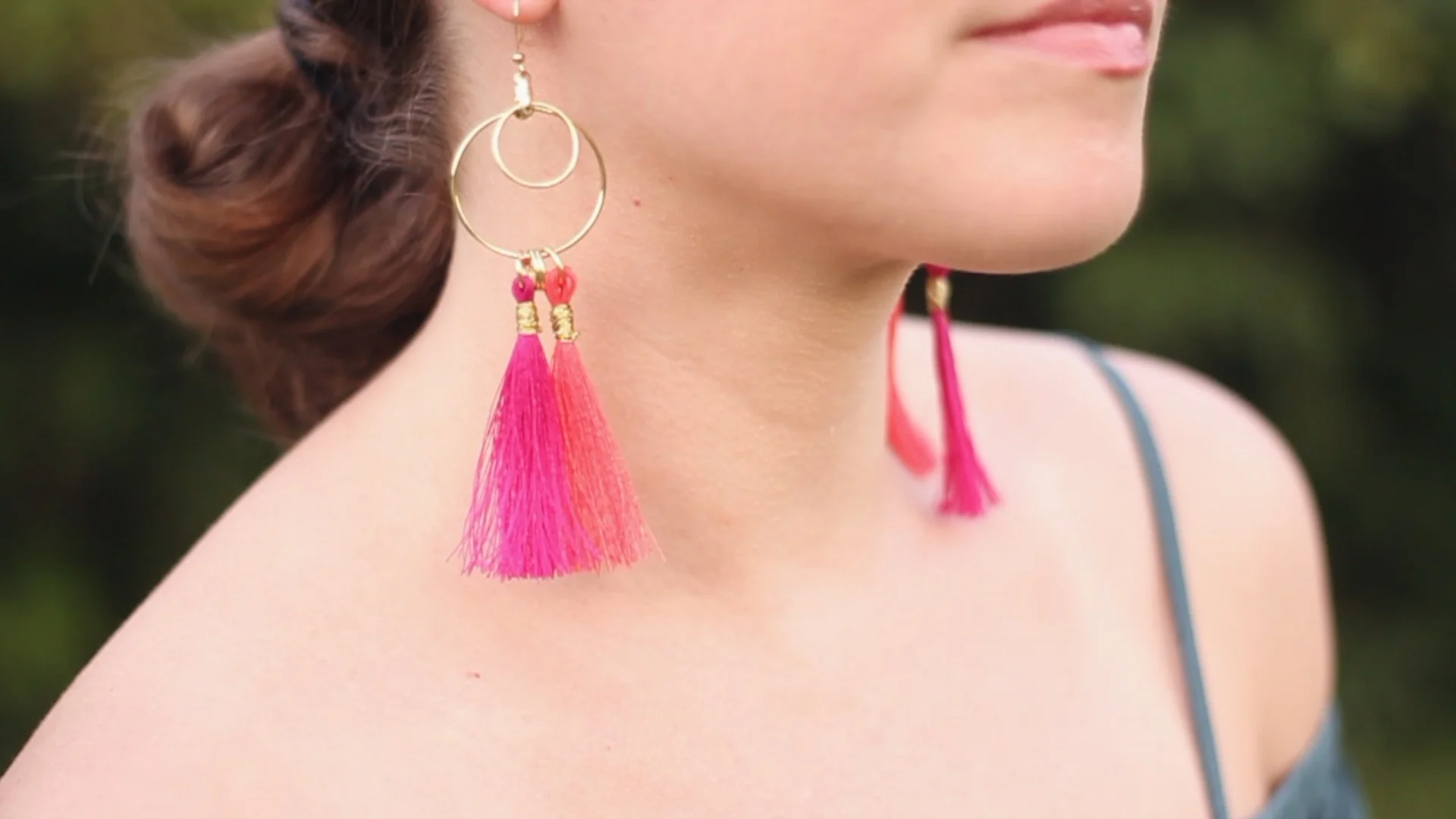 Slide both tassels onto a hoop earring, then trim them so that they are even and the length that you want them to be. Absolutely adore this more casual option. Check out the video tutorial here!