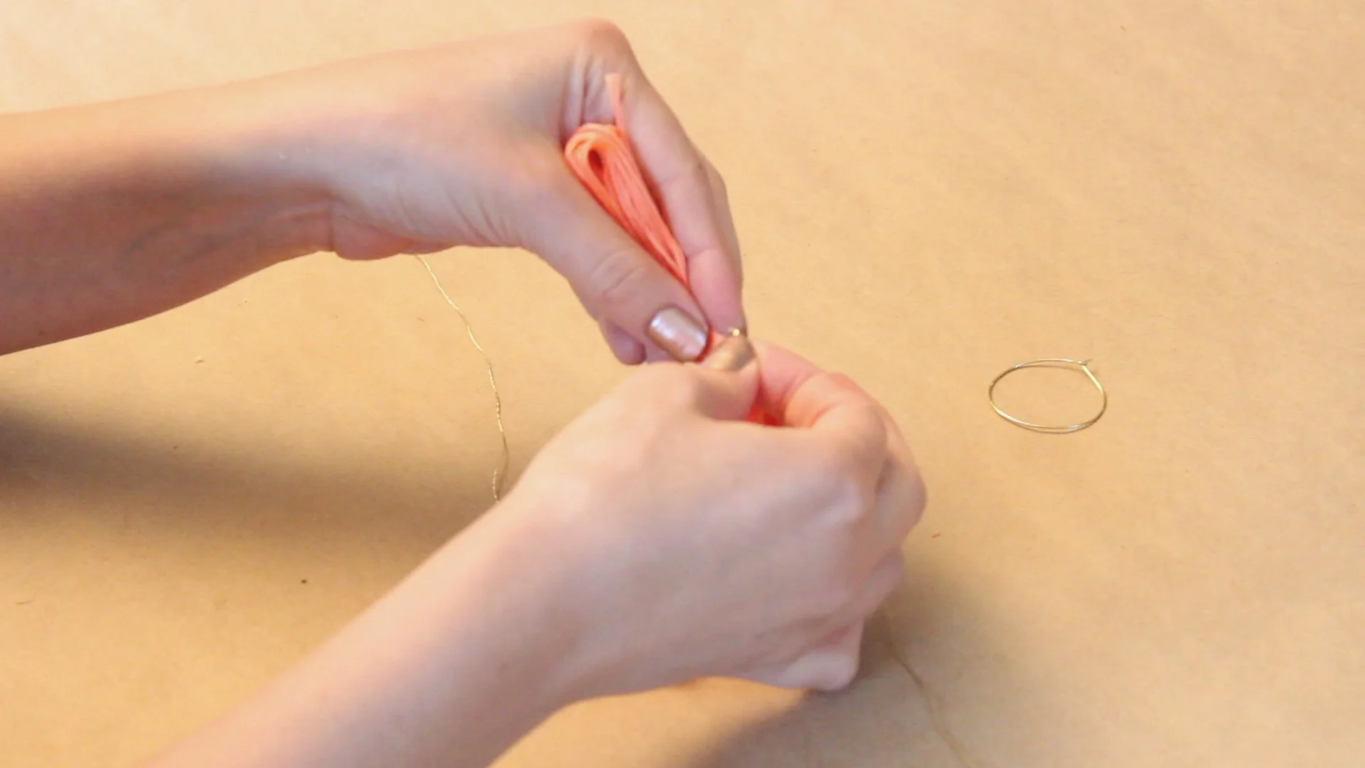 Open a medium size jump ring and slide it around the middle of an entire bundle of embroidery thread. Close the jump ring and fold the thread over it.