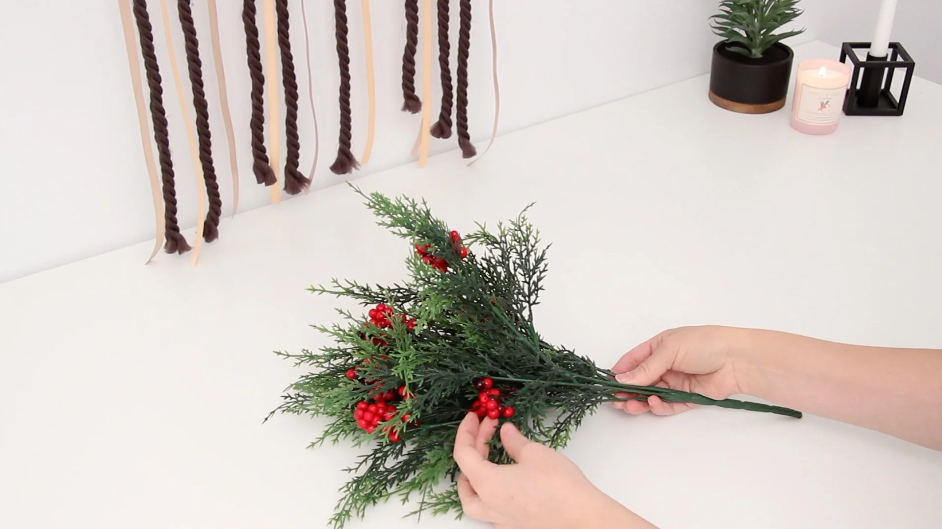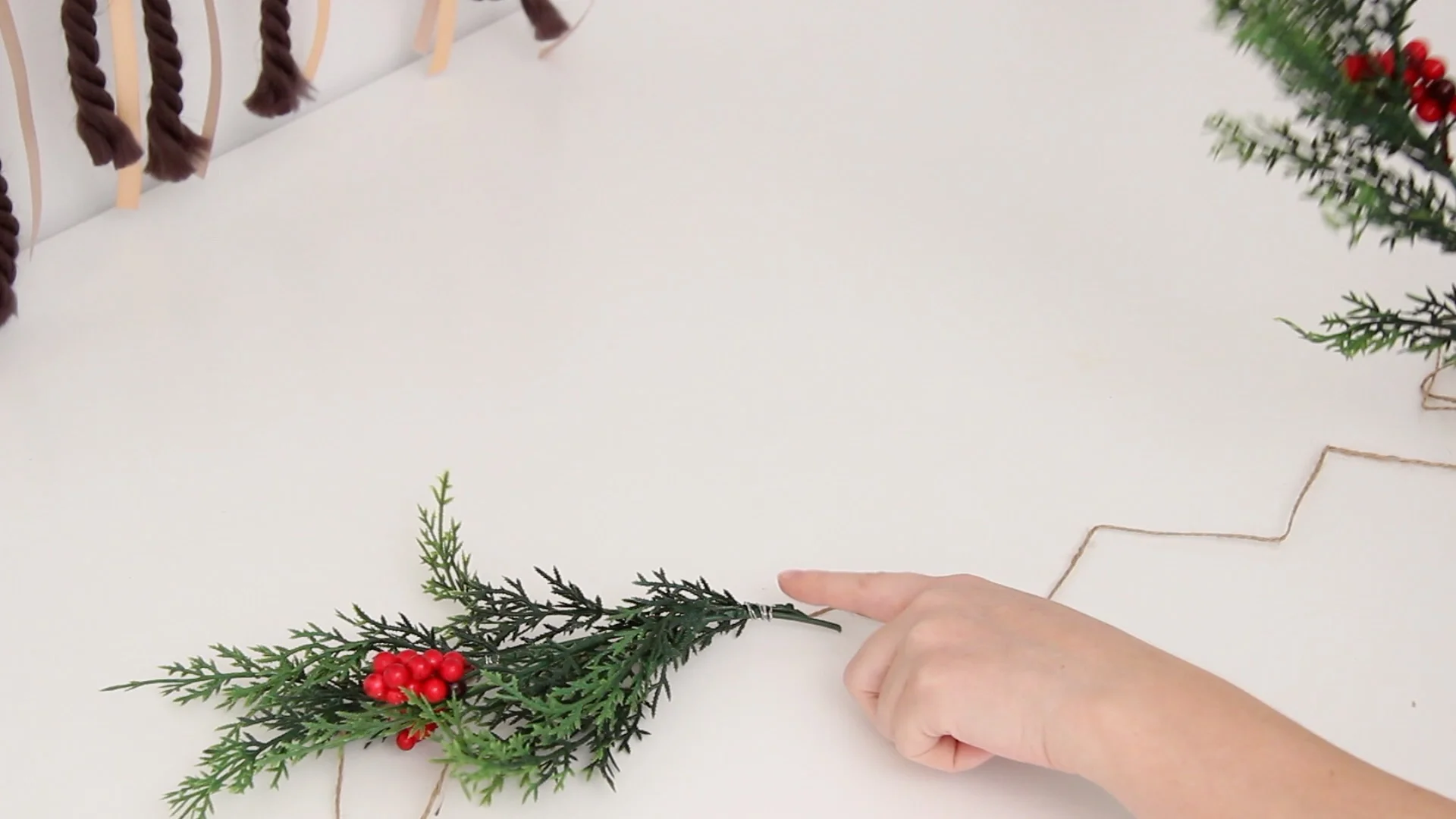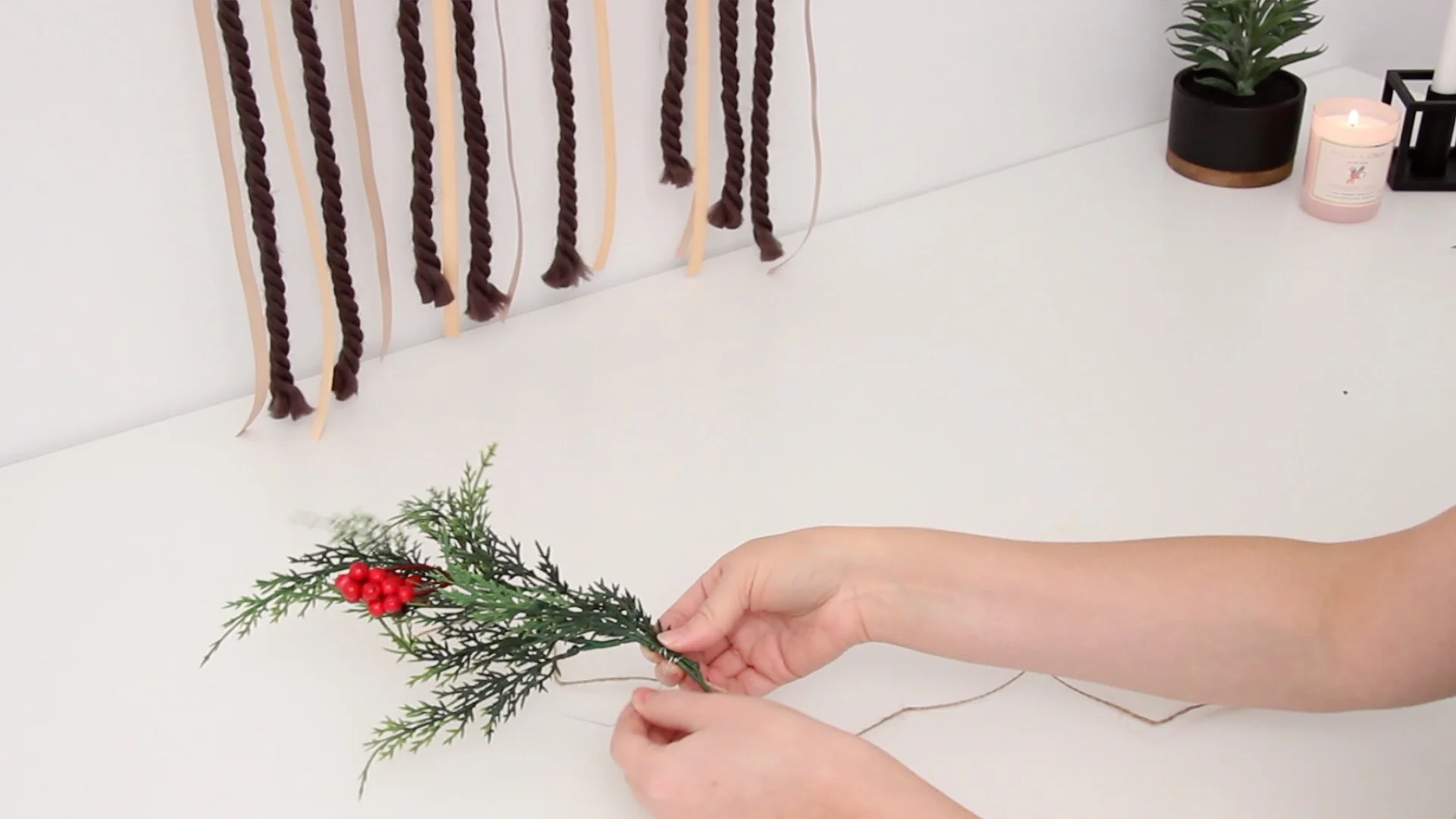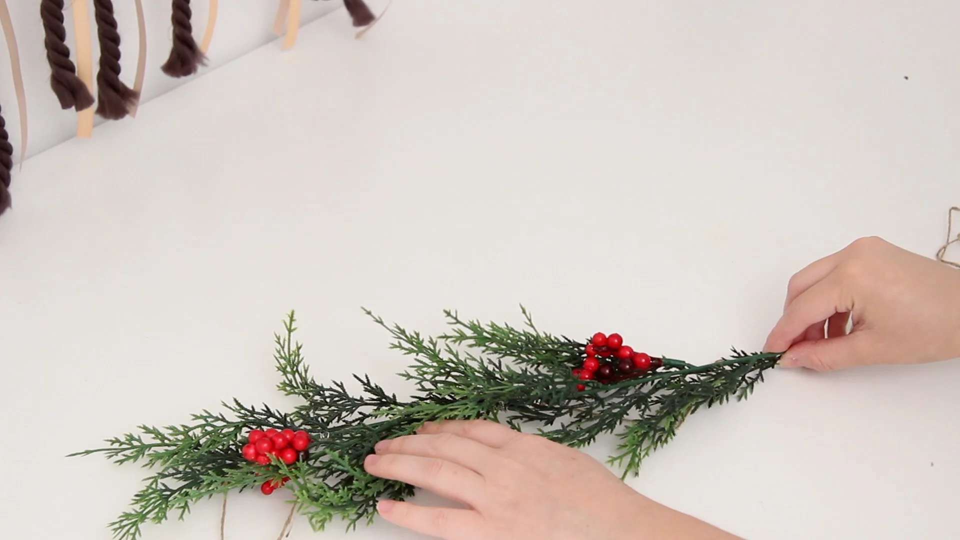You can find sprigs of holiday greens from the craft store for less than $5 each. I only needed to use 2 for this garland. Use wire cutters to cut off individual pieces from the sprig. Leaving a few inches of space on each end of a piece of twine, attach one of the green pieces by wrapping floral wire around both the stem and the twine. Once it is secured at the stem, wrap another piece of wire near the top of the green.