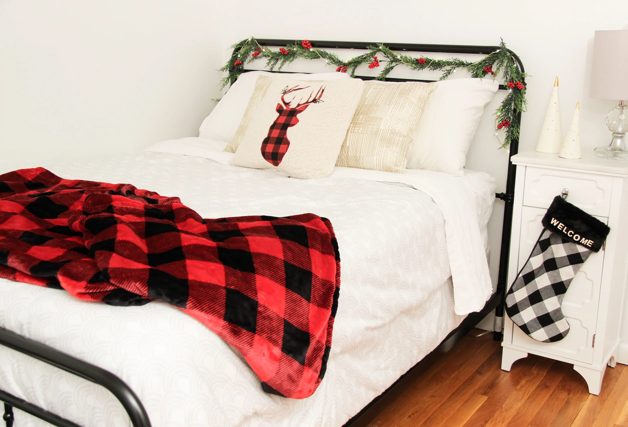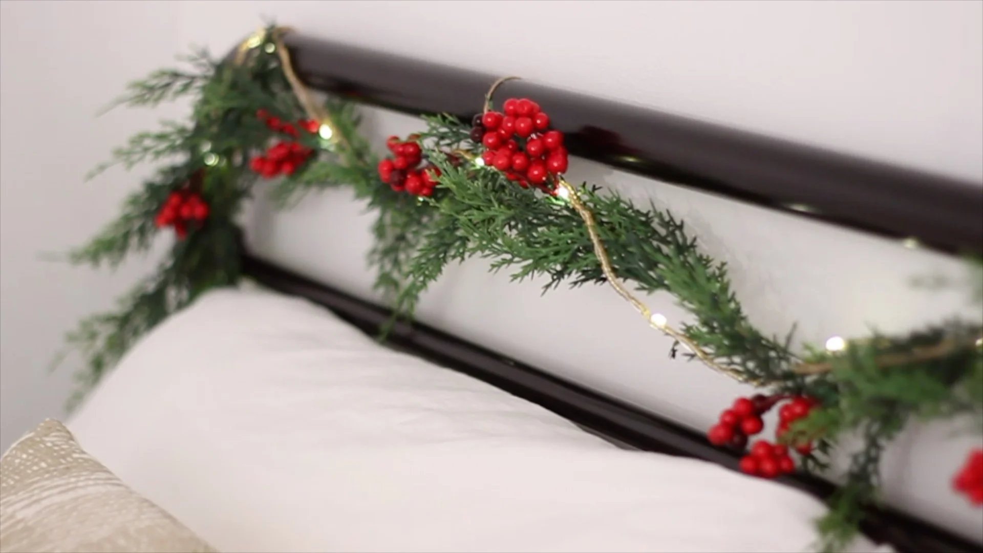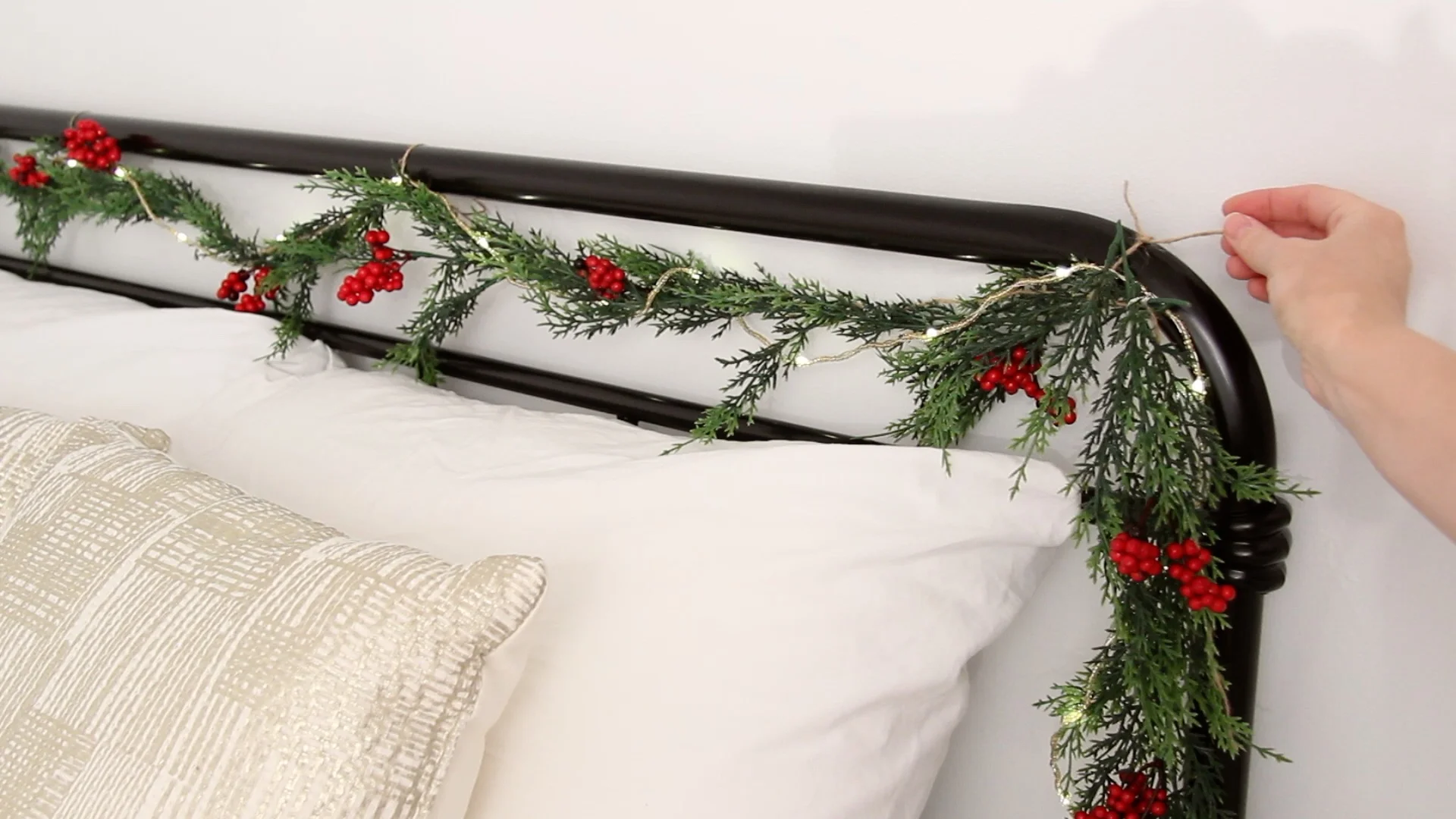 This can be used to decorate a mantel, doorway, or even a headboard which is what I am using it for! To hang it, I use a piece of twine to secure it to the headboard, placed a piece of garland over it to cover it up, and then slid the knot to the back to hide it. It is such a gorgeous addition to the guest room at our house, and will be so welcoming for holiday guests.