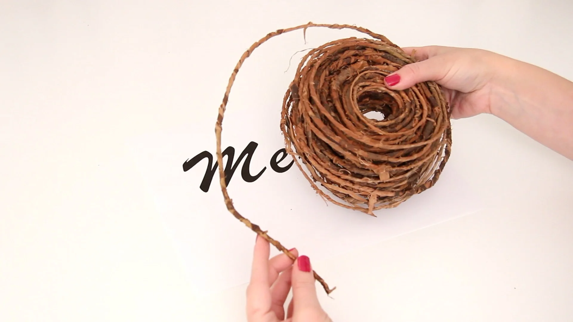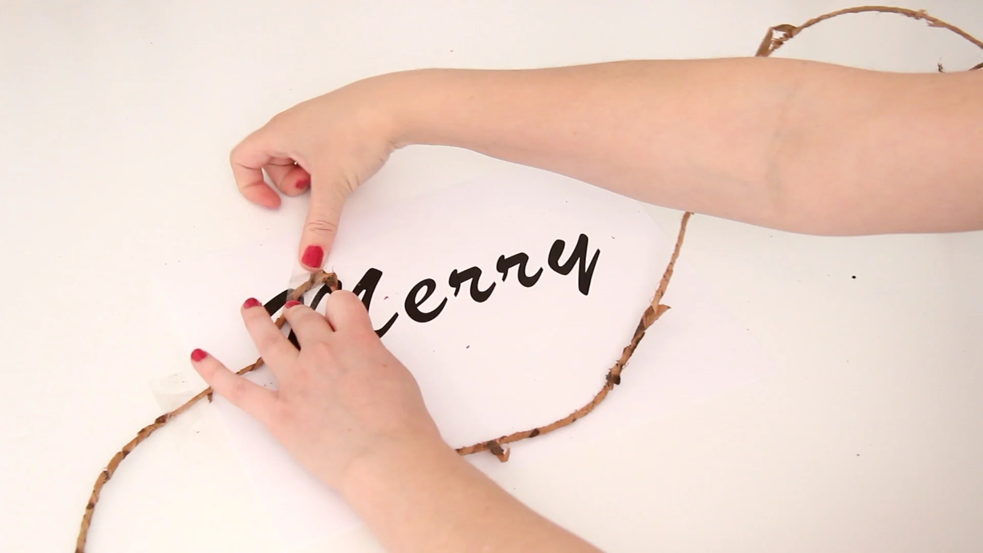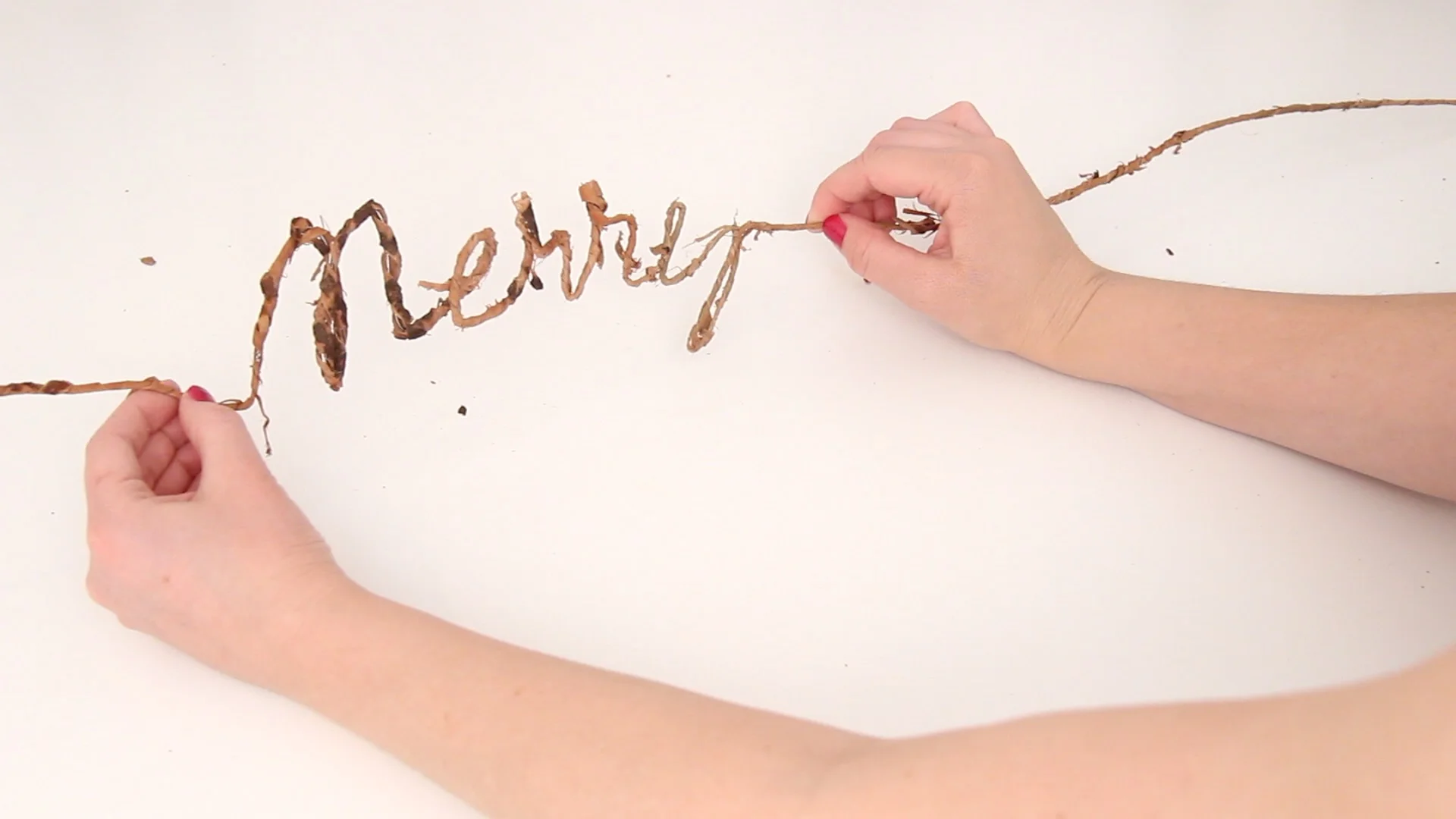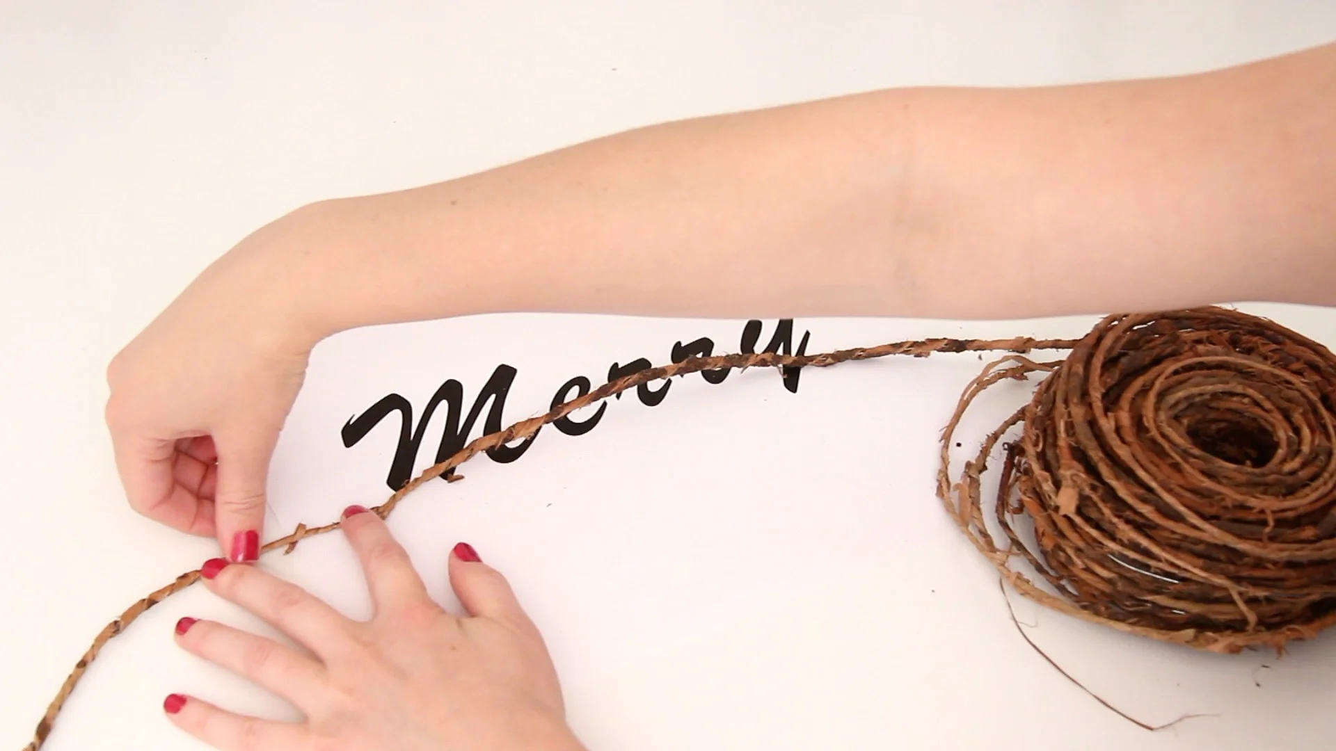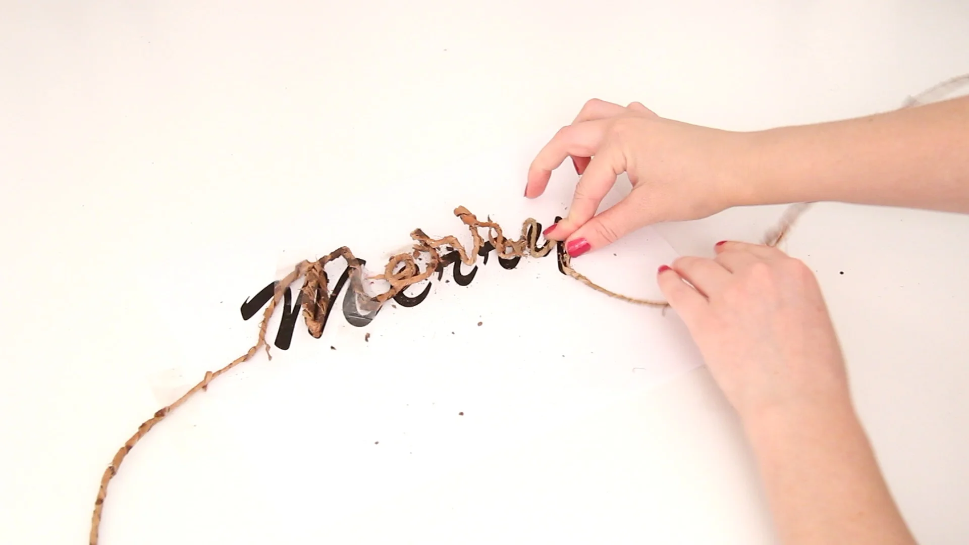 Choose a wire that is easily bendable. This rustic bark covered wire adds the perfect contrast. Leaving about 6 inches on the end, tape down the wire and begin to bend it along the word template. Tape down each section as you go so that it doesnāt move around.