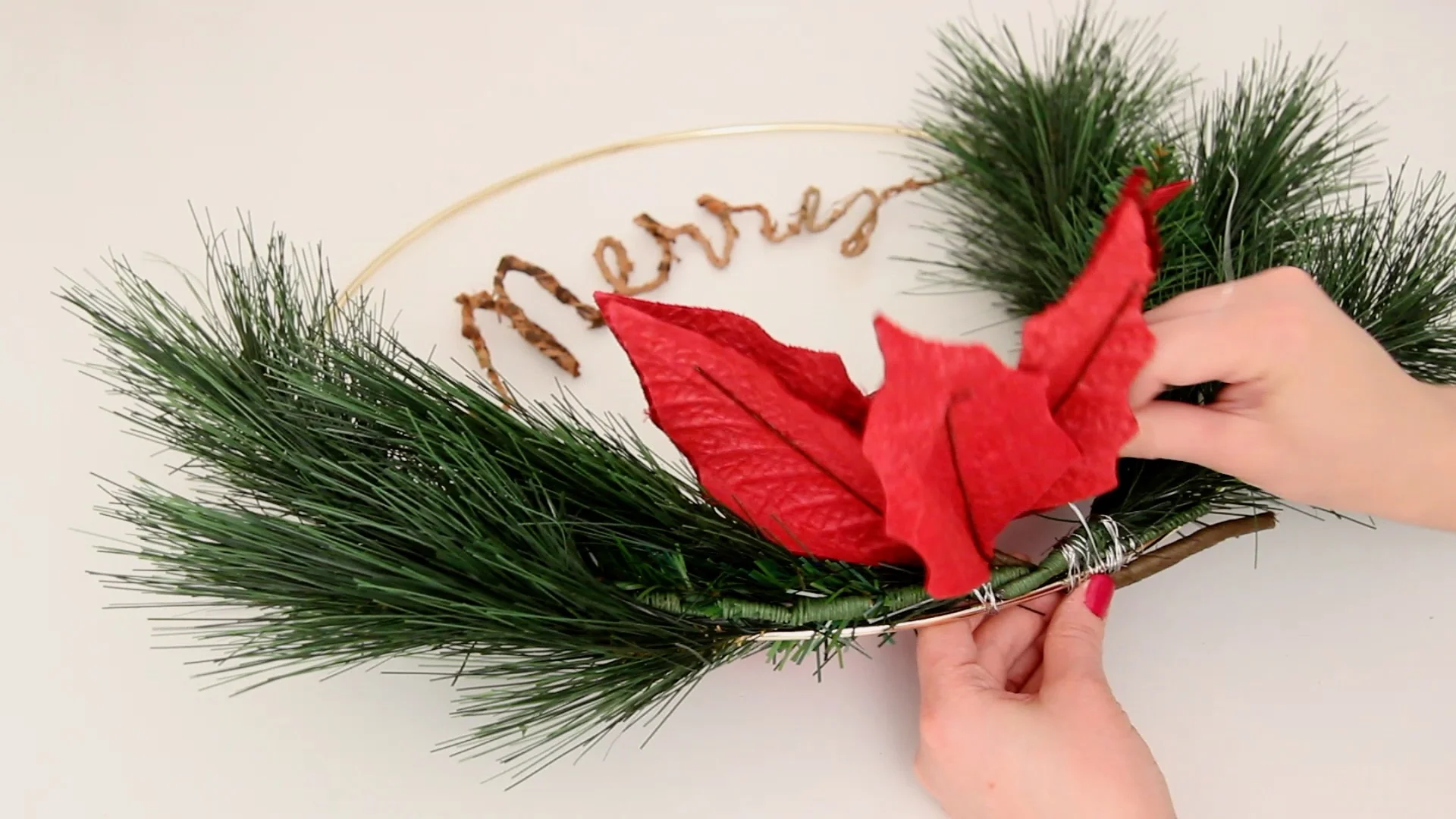 Choose greens and florals that complement each other well. Line them up on your hoop before securing them so that you can get an idea of how they will look when you are finished. Secure them with floral wire in multiple spots to make sure that they wonāt move around. Use each piece to hide the wire from the previous item that you added.