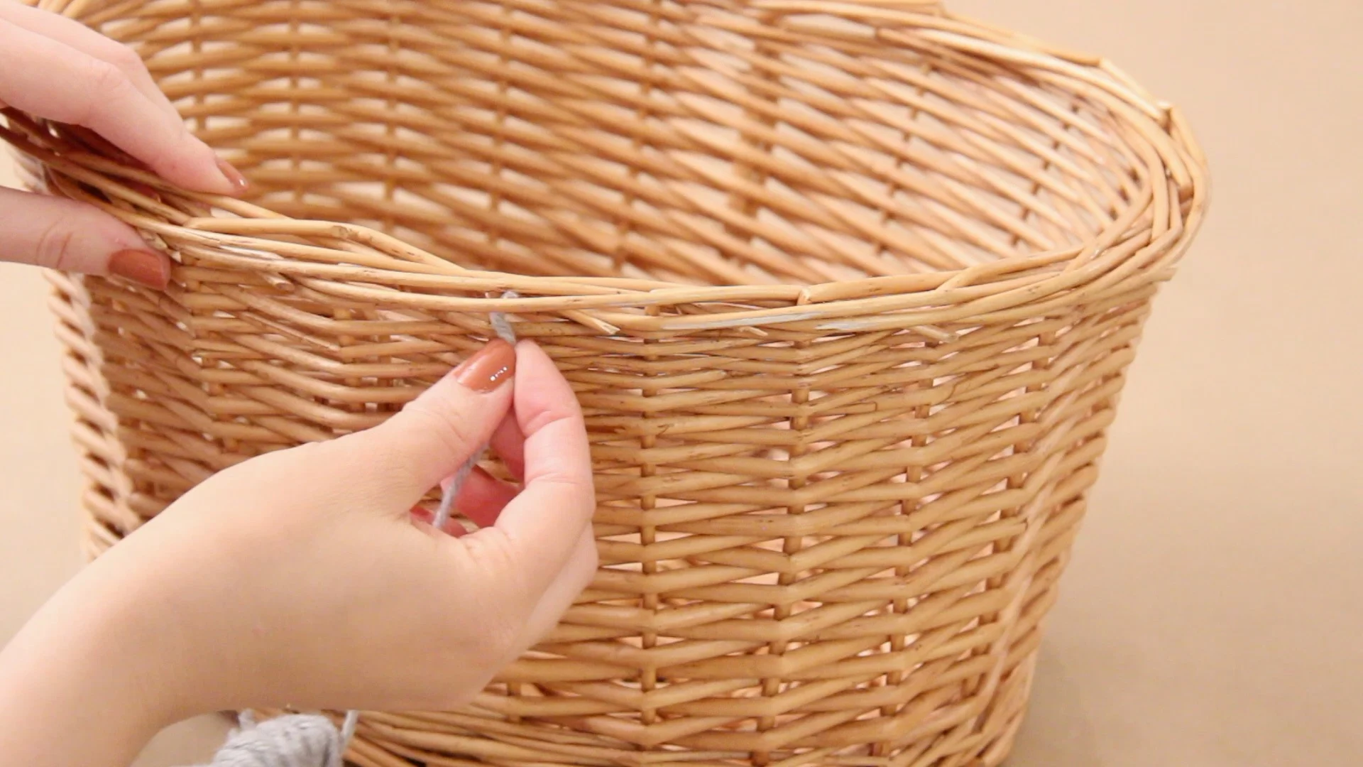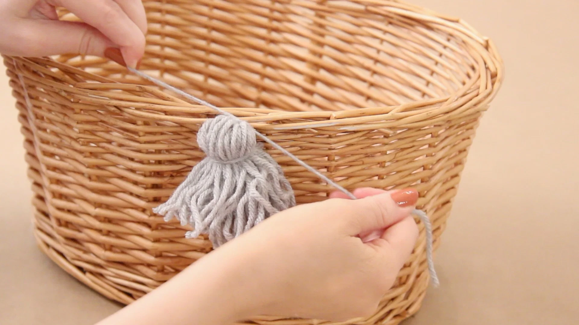 Find a point on the basket where you can attach the tassels, mine had a band across the top where I could easily slide the yarn underneath and tie a double knot.