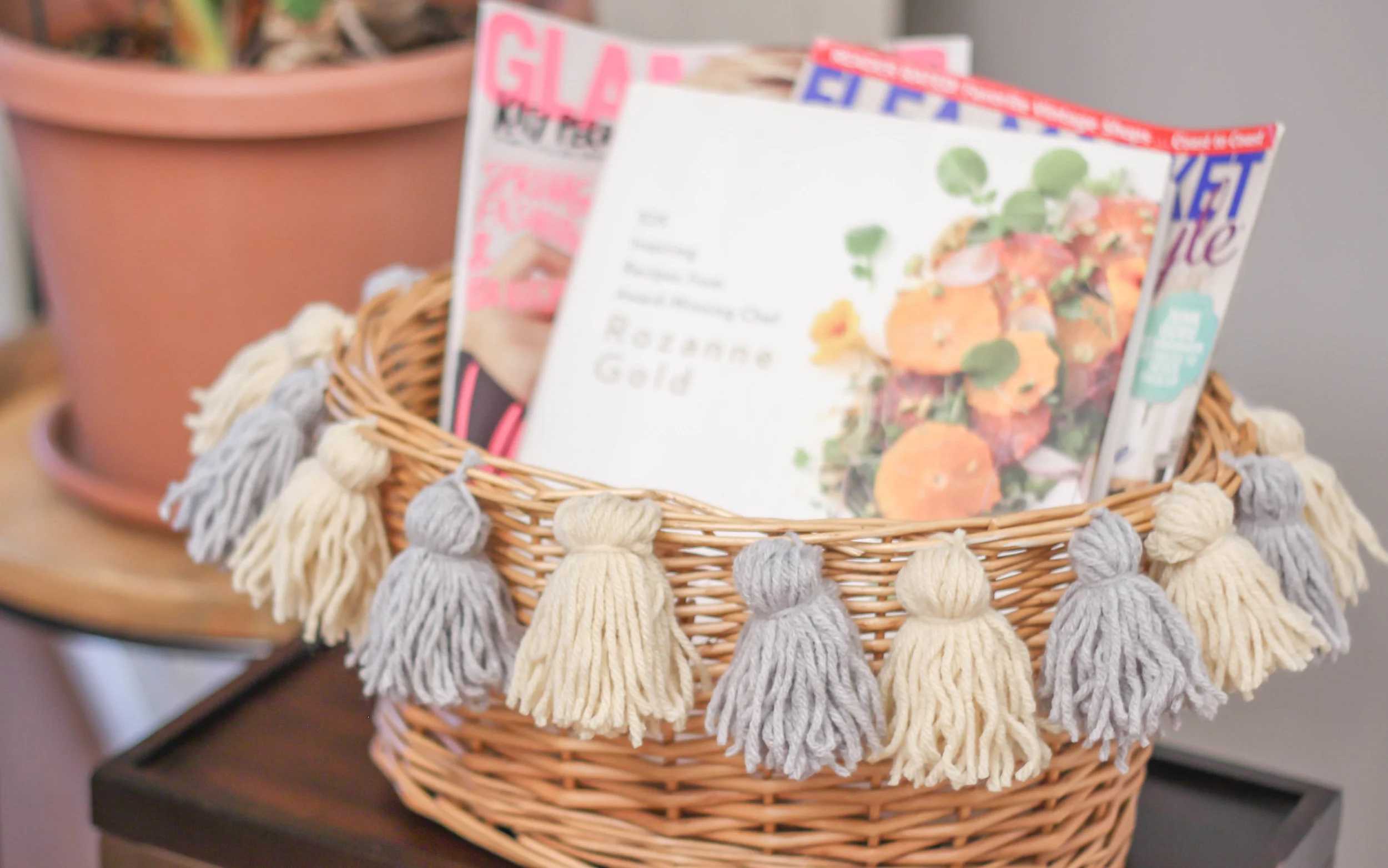 Continue adding tassels in alternating colors all the way around the basket and there you have it!
