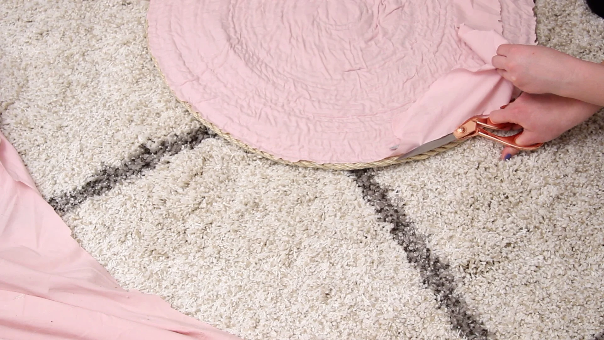 Once you are happy with the size, use scissors to start cutting the sheet about an inch or two out from the rope. This does not have to be perfect, you are just trying to cut it away from the larger part of the sheet or fabric. Next, flip it over and begin to cut in more closely. Be careful not to cut the rope, but try to cut as far in as you can so that you won’t be able to see the fabric underneath when the rug is right side up.