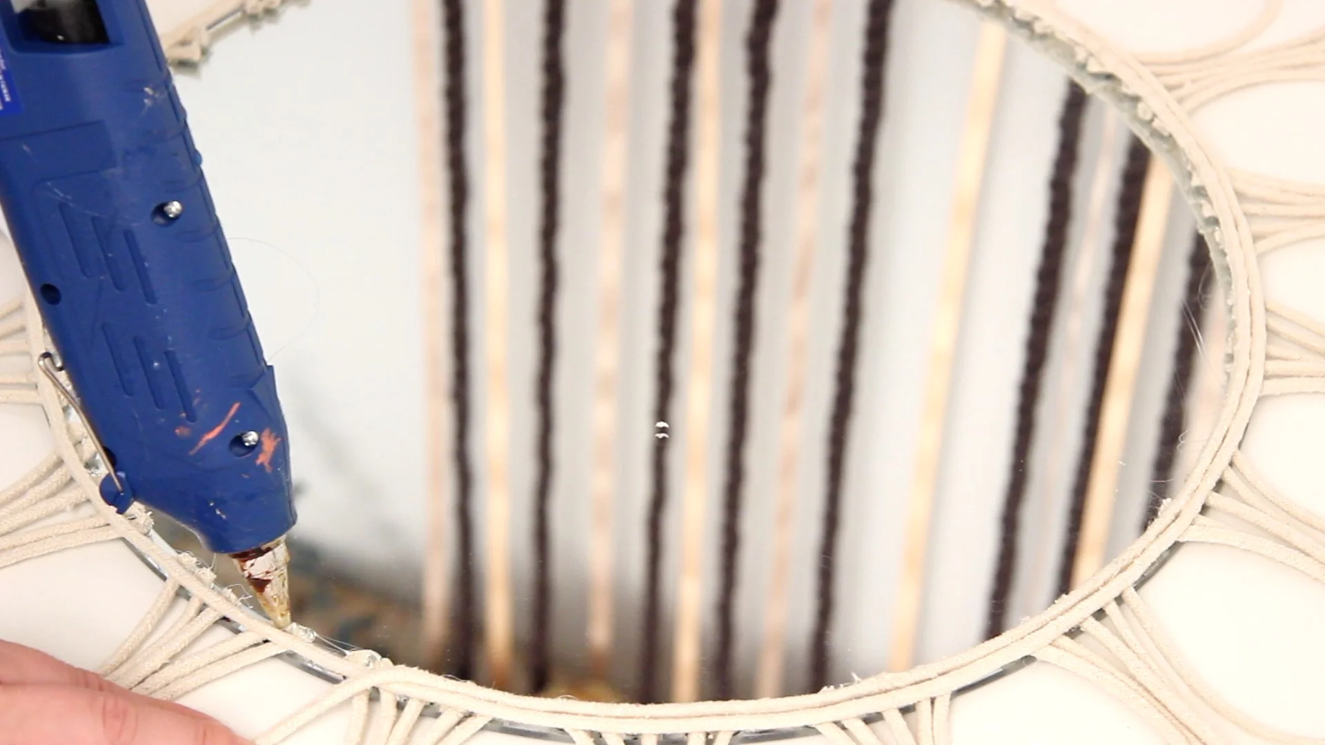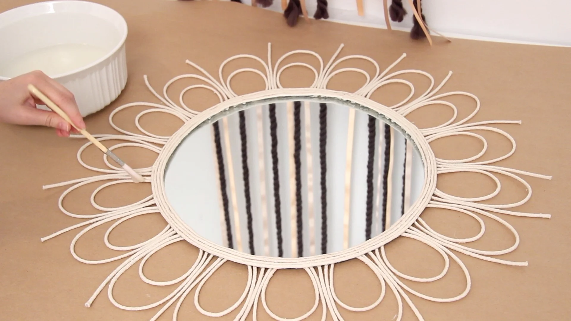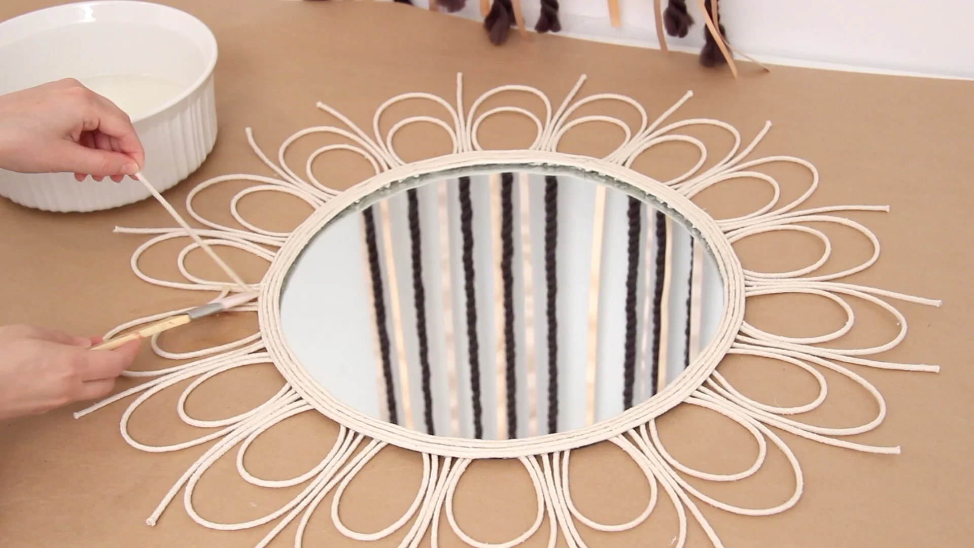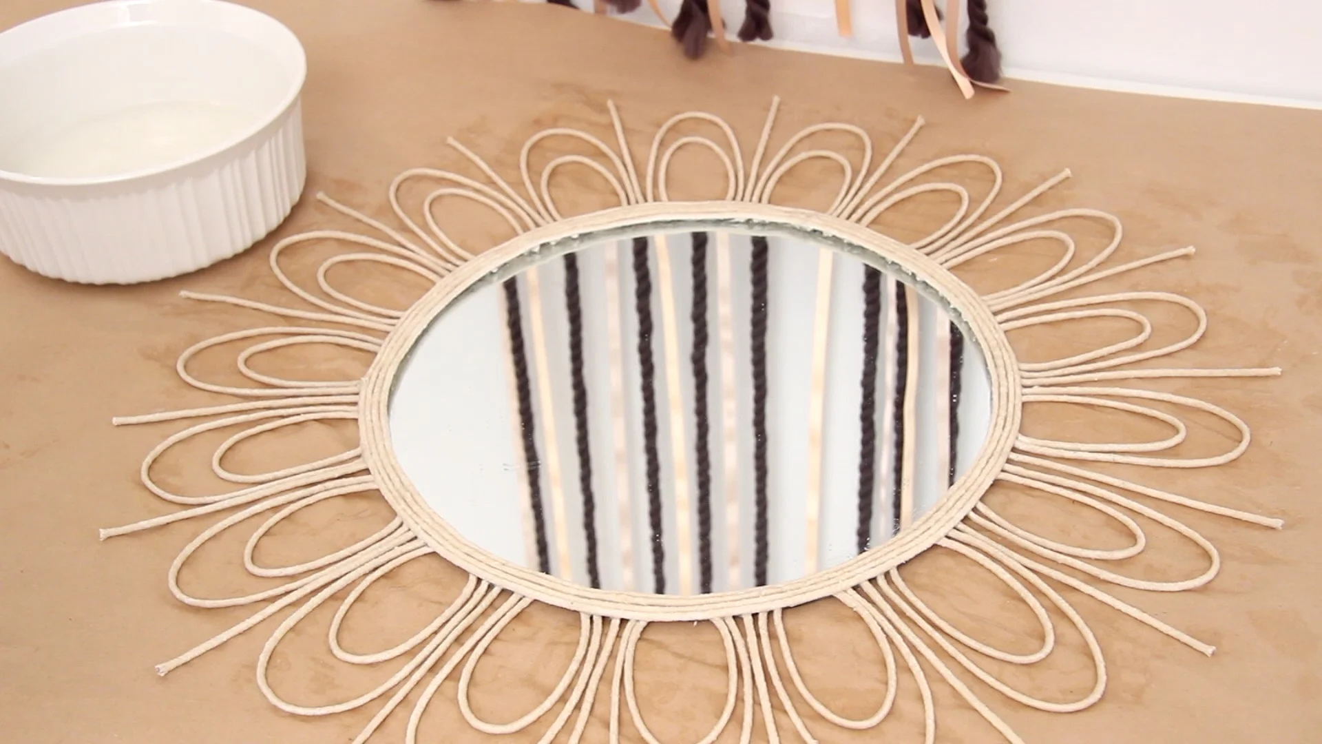 To cover up all of the pieces that were glued down, I glued more macrame cord about 4-5 times all the way around the mirror.