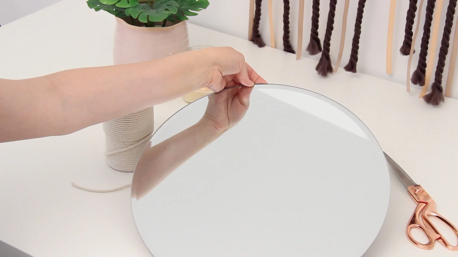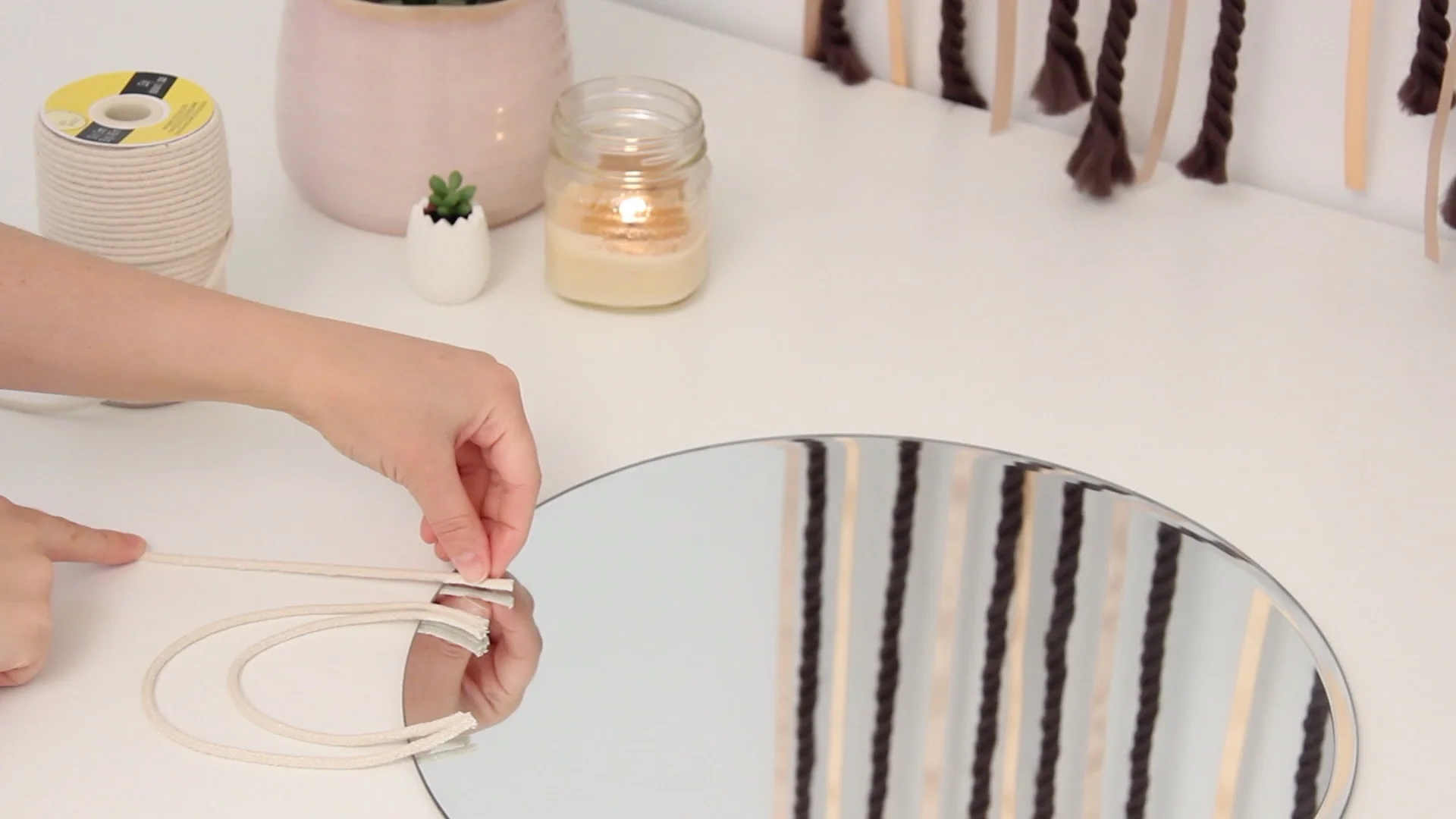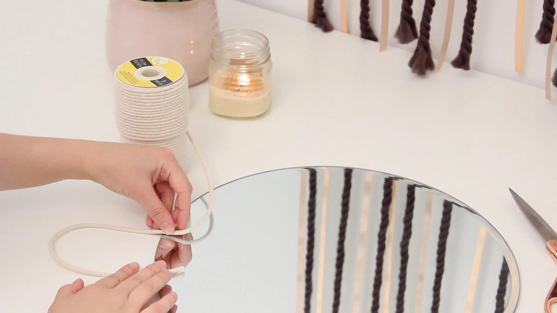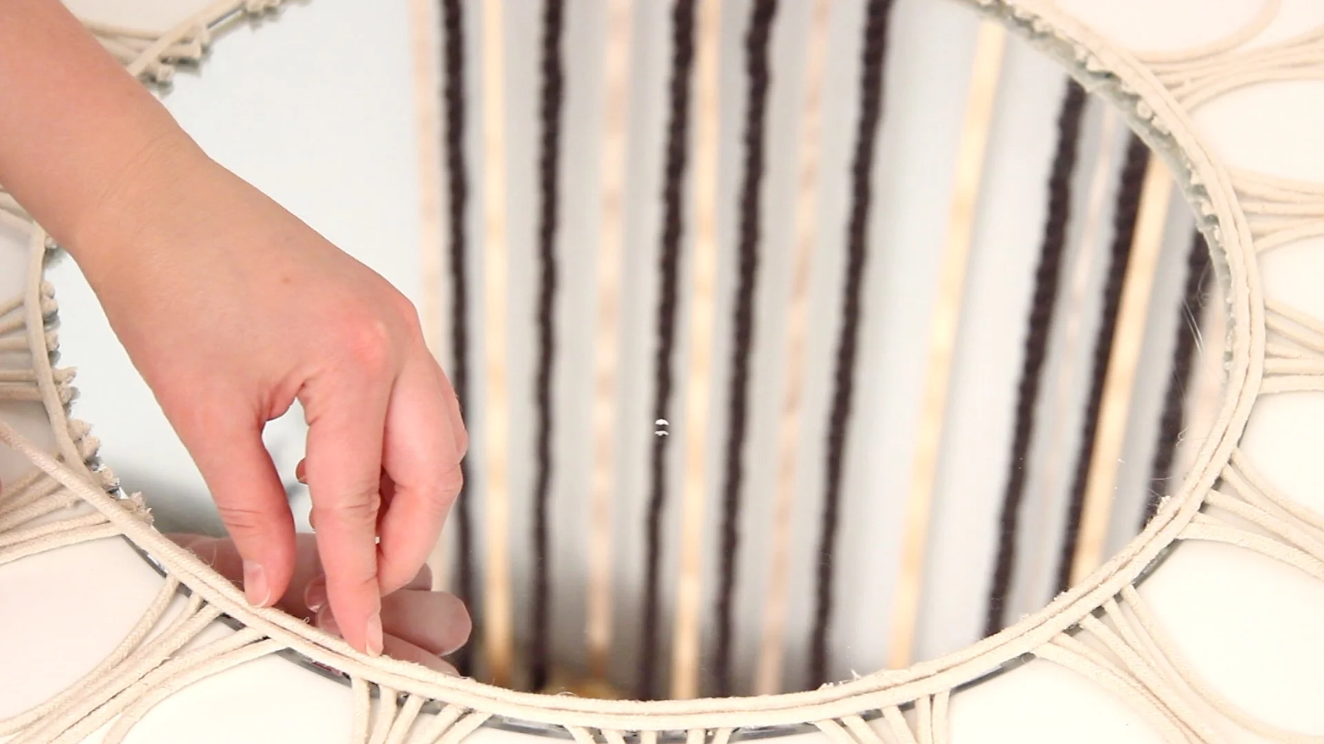 To cover up all of the pieces that were glued down, I glued more macrame cord about 4-5 times all the way around the mirror.