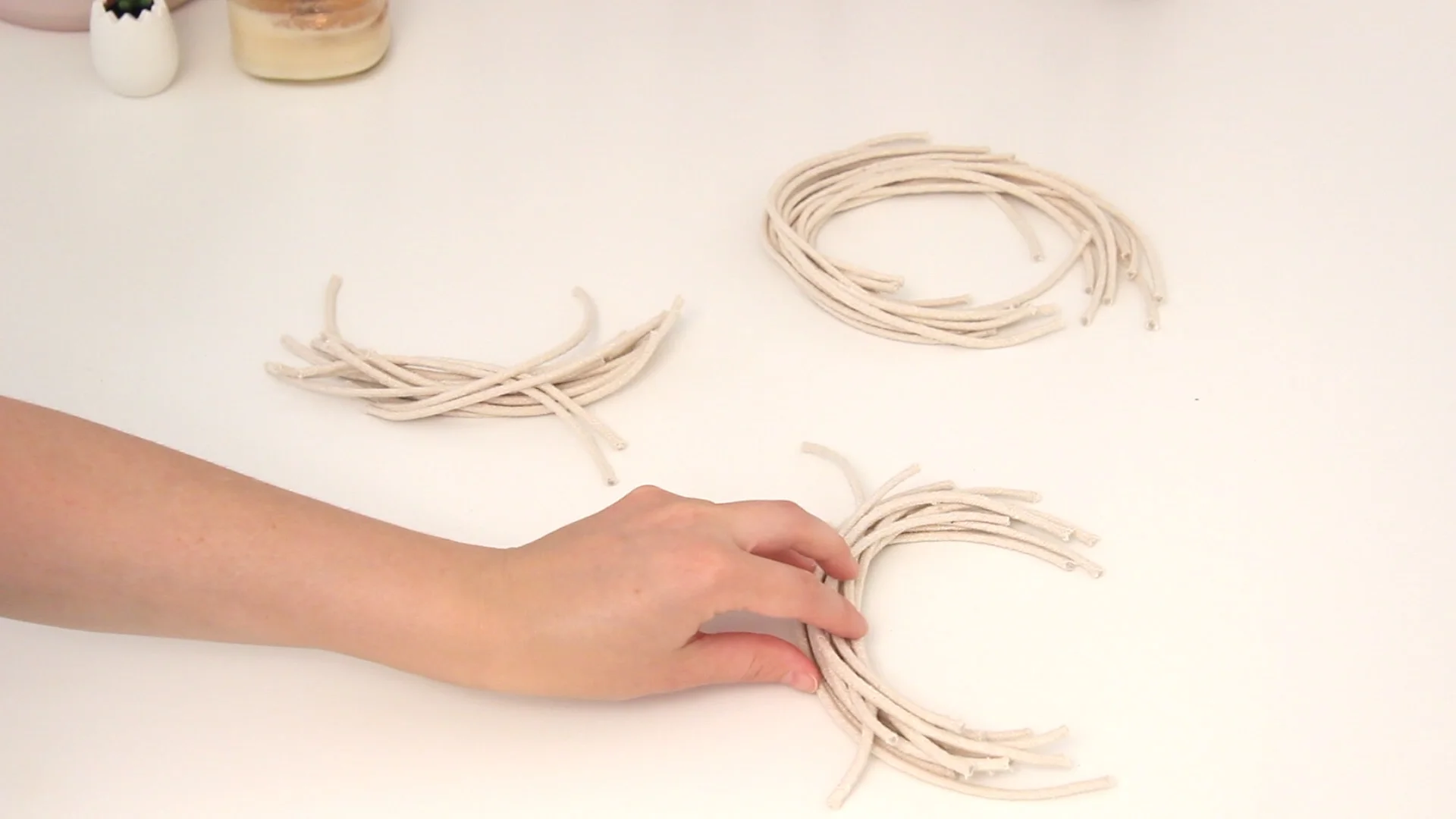 Using a paintbrush, I painted a generous amount of the cornstarch mixture on both the top and bottom of each piece of cord. Make sure you cover each piece entirely, then form it into the shape that you would like it to stay in permanently. I lined my table with kraft paper, but I would recommend using wax paper or plastic instead, so that it does not stick once it’s dry. Allow to dry for 12 hours then carefully peel away from your surface. To hang it up, I used the Command Brand velcro picture hangers.