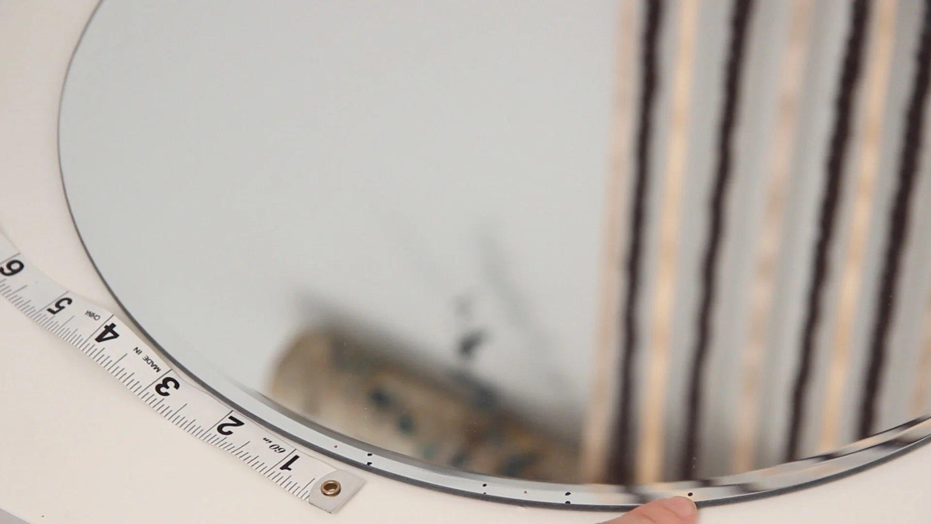 With this decided, I used a tape measure, and two different colored sharpies to make marks the entire way around the mirror. I started with a black dot for one end of the large oval, then moved over an inch and a half and made another black dot for the second end of the large oval. Then I moved over half an inch and made a red dot for the straight piece, then another half inch and started over with a black dot. I repeated this pattern all the way around the mirror.