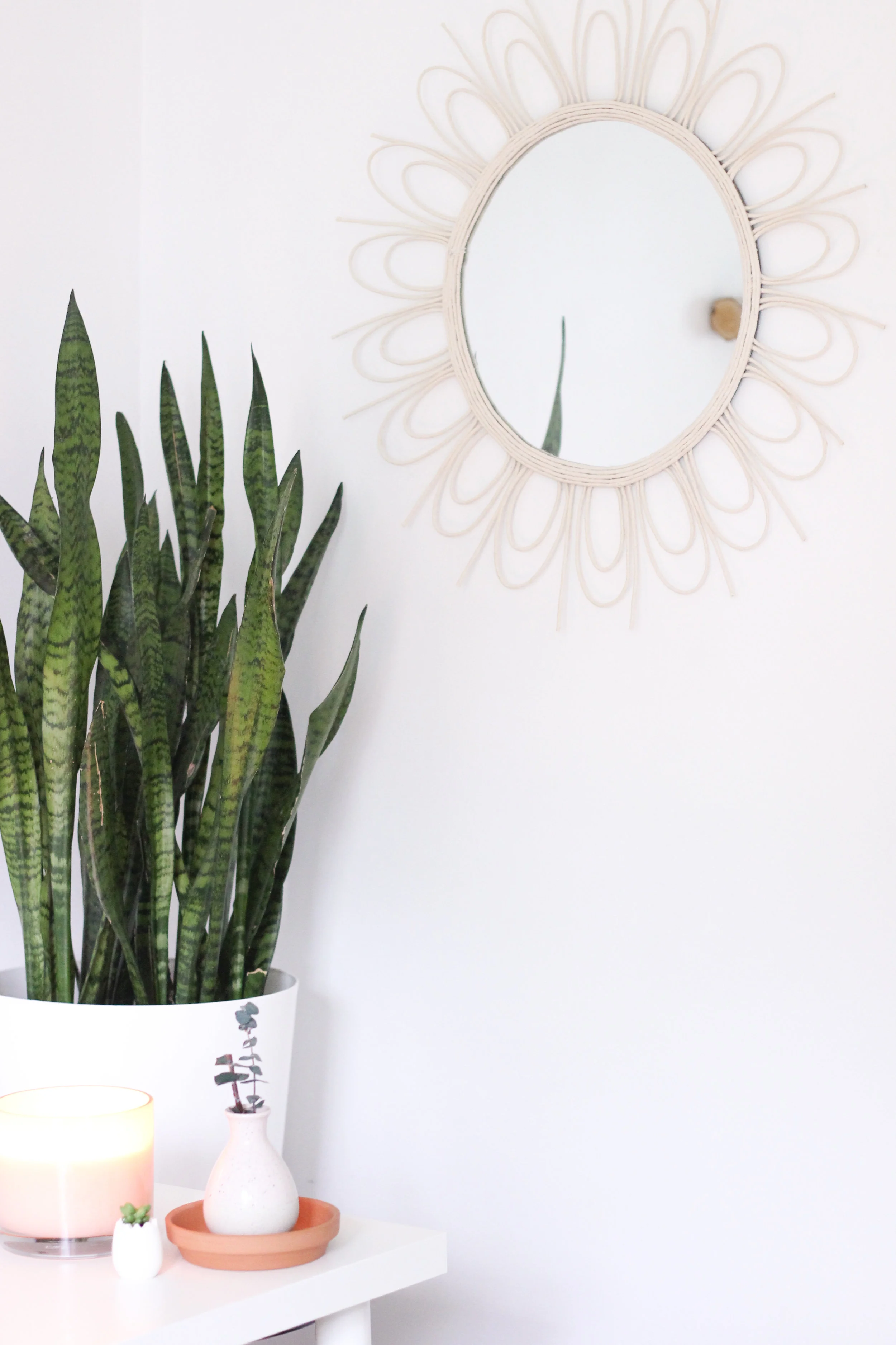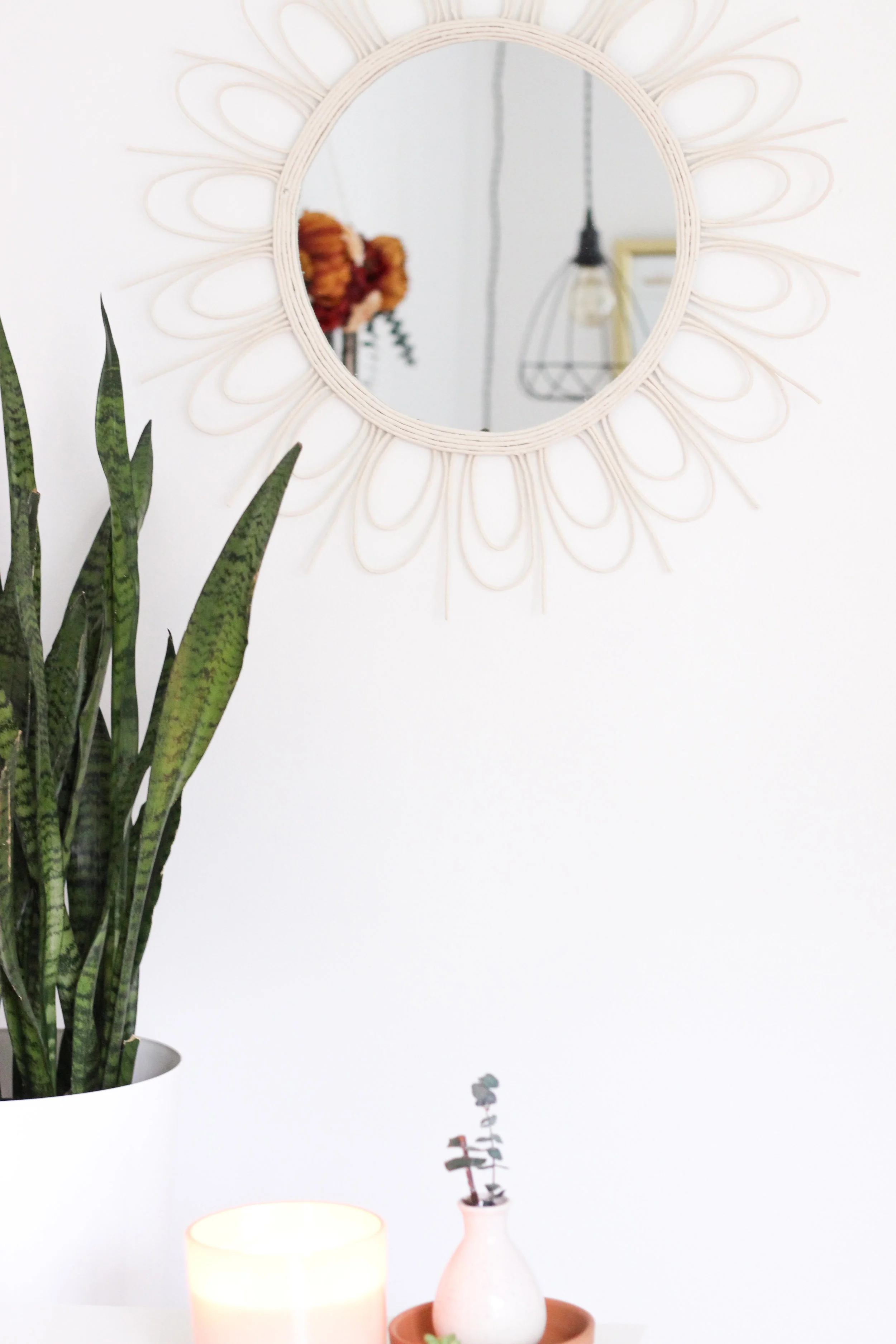 The rattan furniture trend is out in full force and I am 100% on board with it. Rattan chairs, headboards, and bags, I’ll take one of each please! One of my favorite designs is the rattan mirror, so I decided to recreate the style with materials that I already had on hand. Instead of using actual rattan, I used macrame cord and mimicked the style, and I love it!